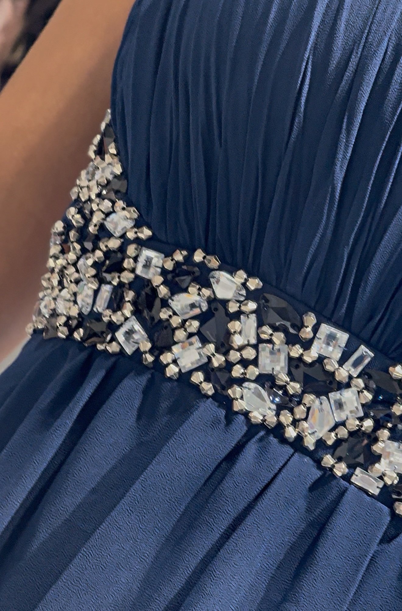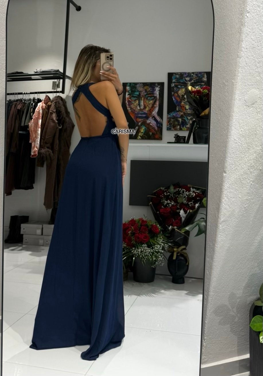 Το Navyelle είναι ένα αριστοκρατικό maxi φόρεμα σε βαθύ μπλε, με ανάλαφρη ροή που χαρίζει κίνηση σε κάθε βήμα. Η ανοιχτή πλάτη με χιαστί τιράντες αναδεικνύει τη σιλουέτα, ενώ η διακριτική ζώνη από λαμπερές πέτρες κάτω από το στήθος προσθέτει μια δόση πολυτέλειας. Ιδανικό για επίσημες βραδιές όπου θες να μαγνητίσεις τα βλέμματα.