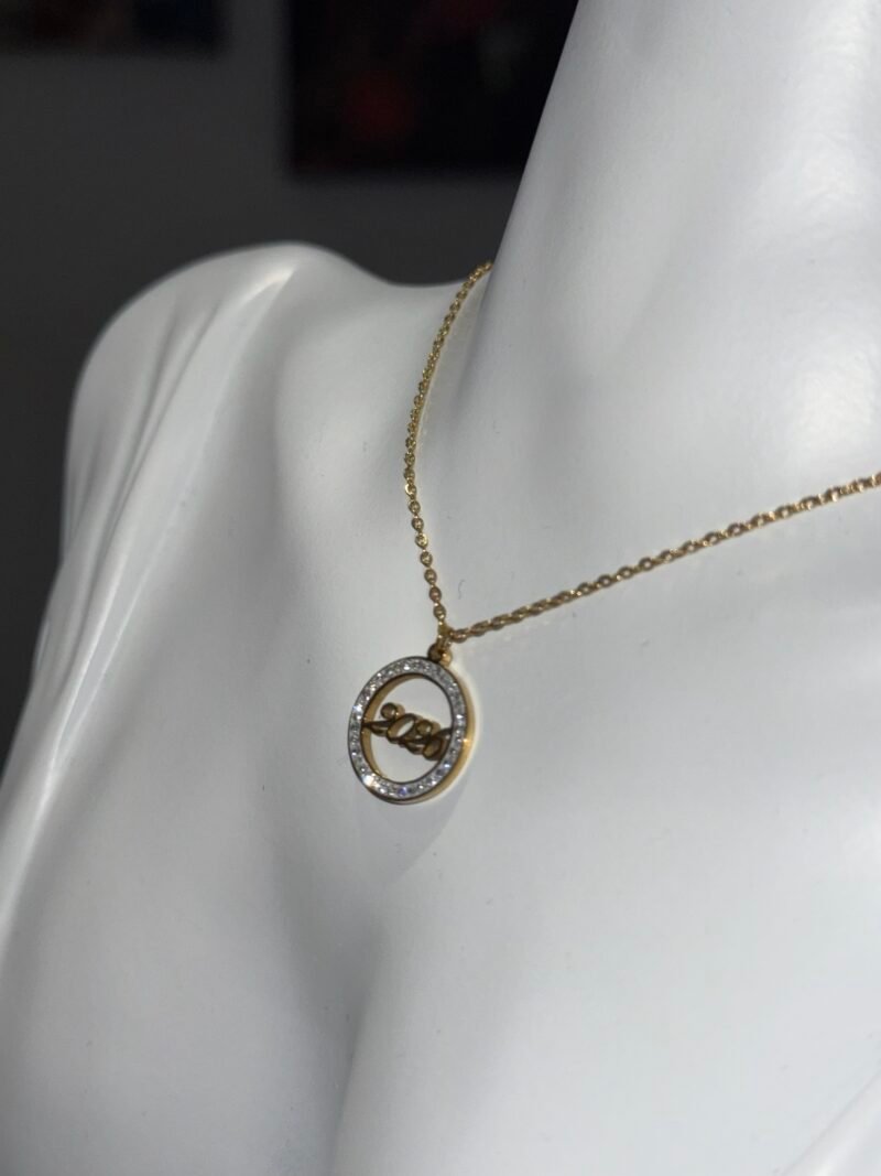 • Λαμπερές Λεπτομέρειες: Το μενταγιόν έχει κυκλικό σχήμα, με την περιφέρειά του να είναι διακοσμημένη με σειρά από λευκά στρας, προσδίδοντας μια αίσθηση πολυτέλειας.