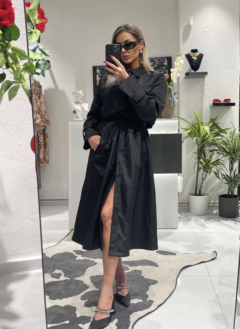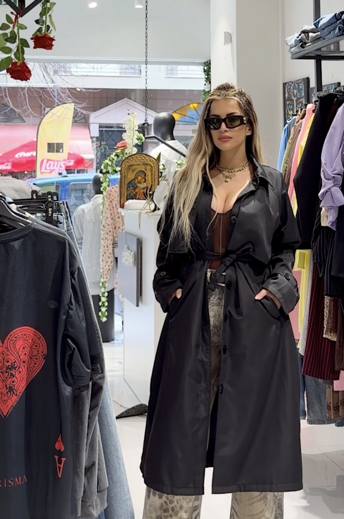Αυτή η κομψή μαύρη καμπαρντίνα αποτελεί ένα διαχρονικό κομμάτι που συνδυάζει το κλασικό στυλ με μοντέρνες λεπτομέρειες, ιδανική για κάθε γυναικεία γκαρνταρόμπα.