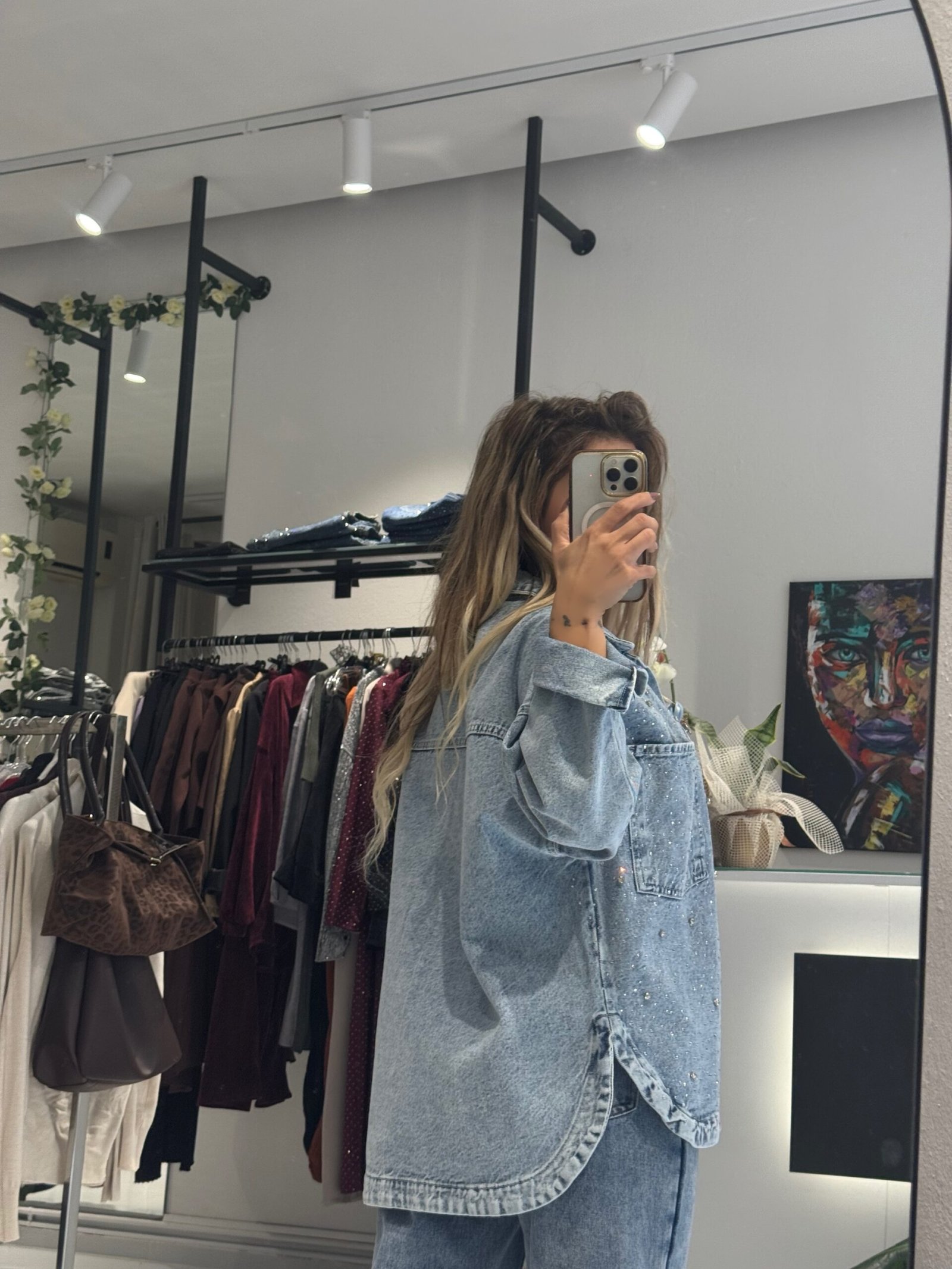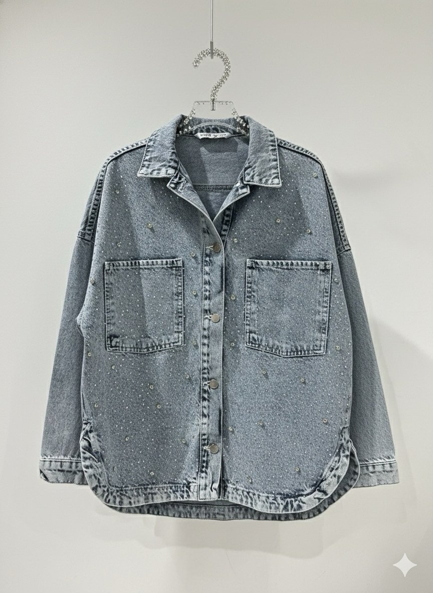Denim με στρας και τρούκς, συνδυάζει τη λάμψη με το ανεπιτήδευτο στυλ, αποπνέοντας αυτοπεποίθηση και φινέτσα. Η oversized γραμμή του προσφέρει άνεση και μοντέρνο attitude, ενώ οι μεταλλικές λεπτομέρειες χαρίζουν τη δόση glam που κάνει τη διαφορά.