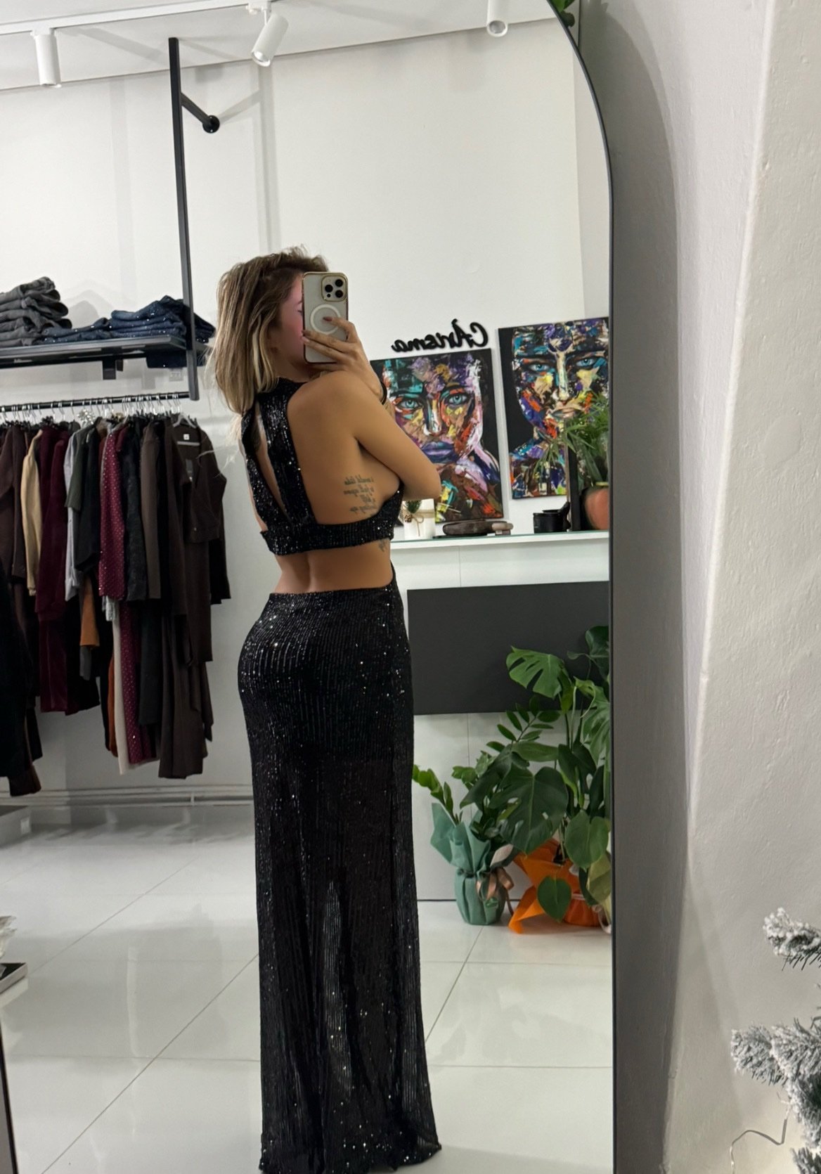• Ύφασμα: Παγιέτα σε μαύρο χρώμα, προσφέροντας μια πολυτελή, αστραφτερή υφή που λάμπει στο φως.