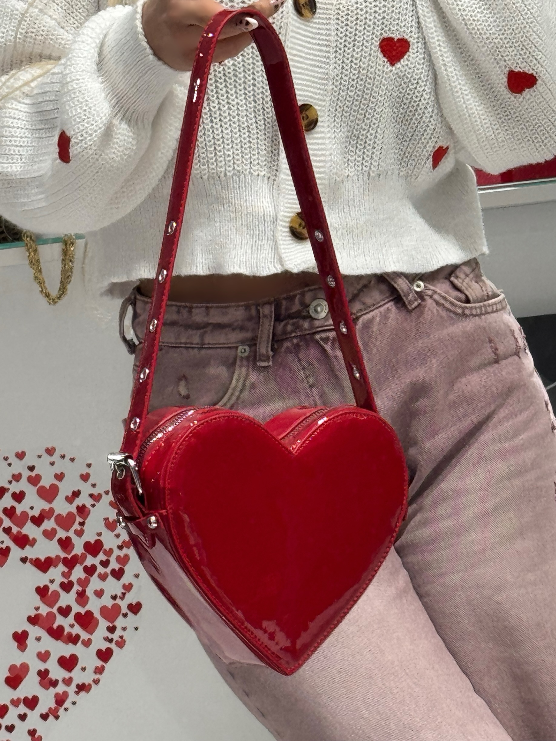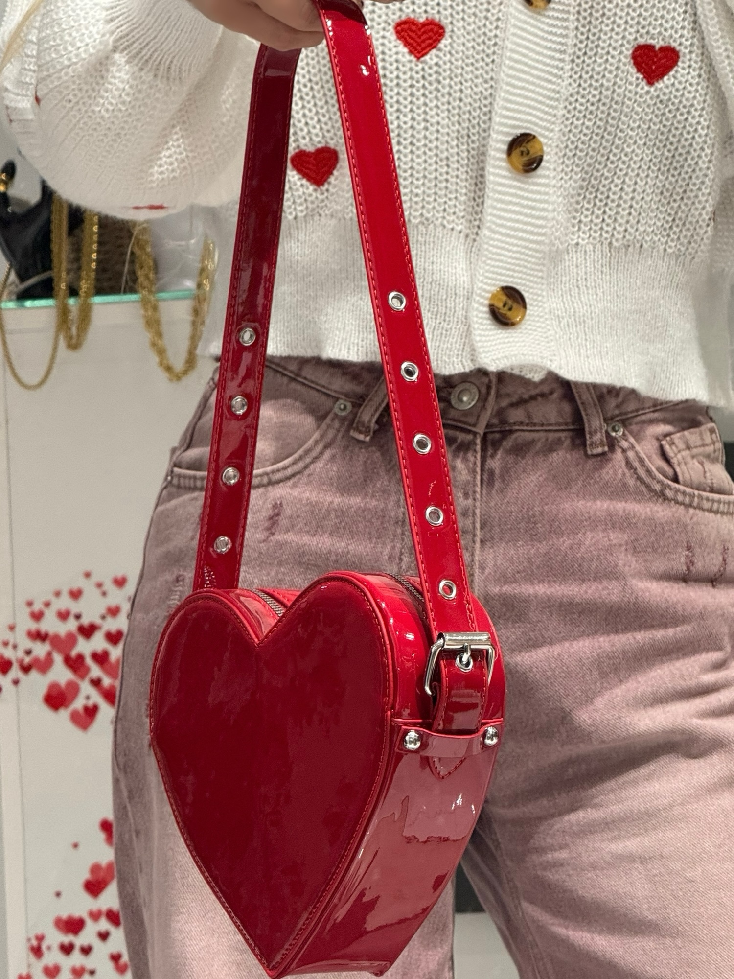 Κάντε κάθε σας εμφάνιση να χτυπά στους ρυθμούς της μόδας με την πιο “ερωτεύσιμη” τσάντα της σεζόν! Αυτή η τσάντα σε σχήμα καρδιάς συνδυάζει την παιχνιδιάρικη διάθεση με την πολυτέλεια του λουστρίνι φινιρίσματος.