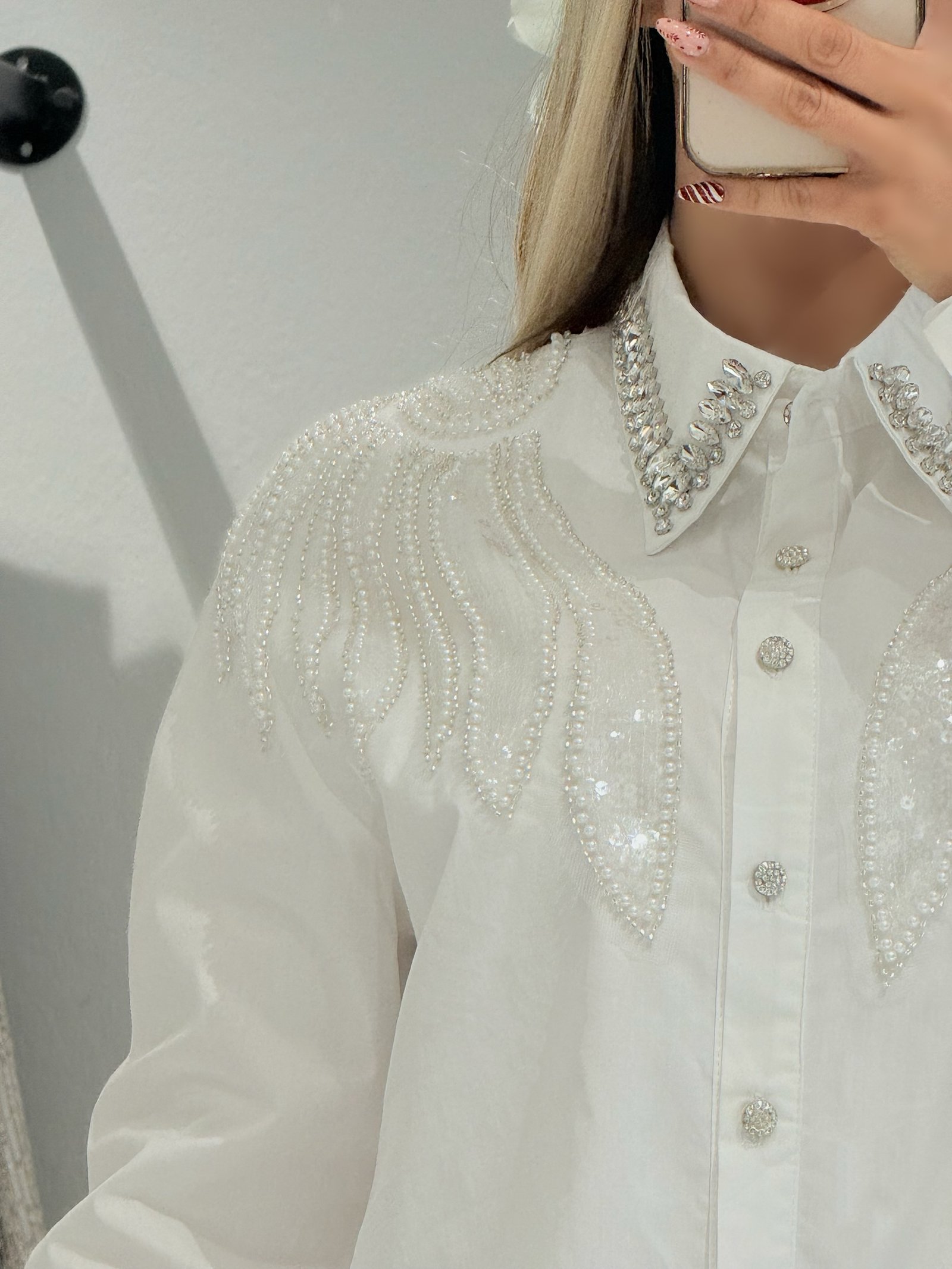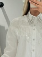 Αναβαθμίστε το στυλ σας με αυτό το one-size λευκό πουκάμισο, το οποίο ξεχωρίζει για την πλούσια και προσεγμένη διακόσμησή του. Σχεδιασμένο με έμφαση στη λεπτομέρεια, διαθέτει: