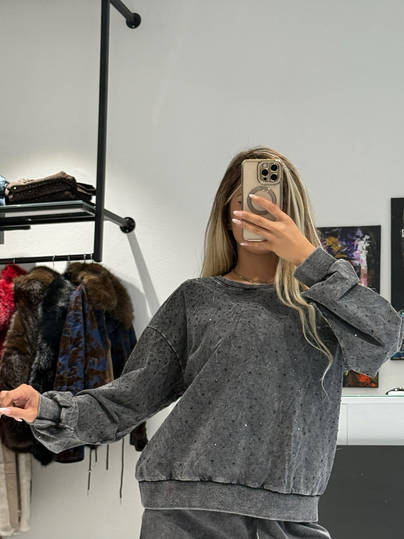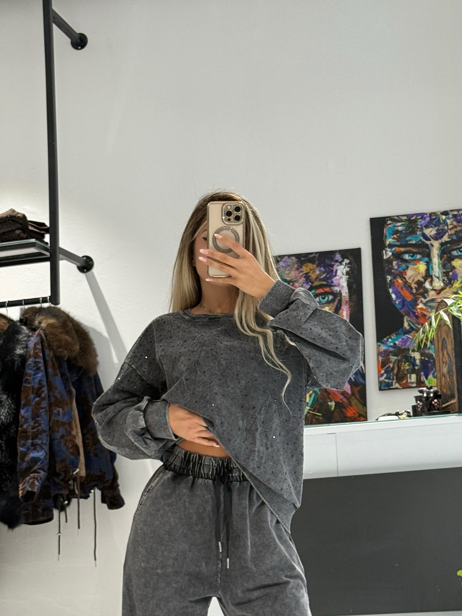 Το σετ “Astrella” φέρνει την urban λάμψη στην καθημερινότητα σου. Διαθέσιμο σε γκρι και μαύρο ξεβαμμένο, με oversized γραμμή one size για άνεση και στυλ. Η μπλούζα είναι διακοσμημένη με στρας που συνεχίζουν και στο παντελόνι, χαρίζοντας διακριτική αλλά δυναμική λάμψη σε κάθε σου εμφάνιση. Ιδανικό για streetwear με χαρακτήρα αλλά και για εμφανίσεις που θέλεις να ξεχωρίζεις χωρίς κόπο.