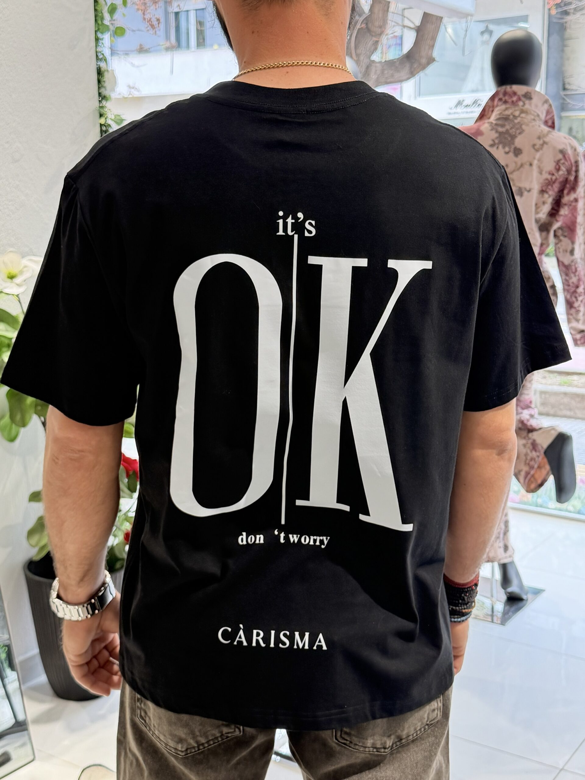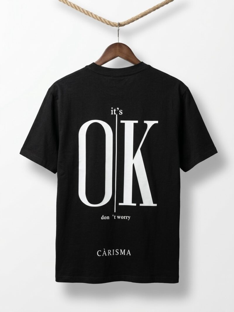 • Πίσω όψη: Διαθέτει ένα εντυπωσιακό, μεγάλο graphic print με το μήνυμα “it’s OK don’t worry”, χωρισμένο με μια κάθετη γραμμή που προσδίδει μοντέρνα γεωμετρία.