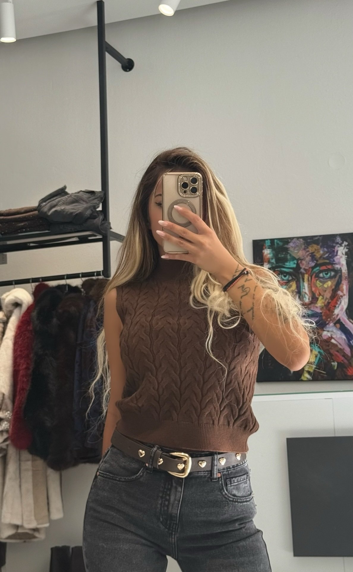 Το “Elara” είναι ένα statement πλεκτό τοπ που αγκαλιάζει τη γυναικεία φιγούρα με στυλ. Η απουσία μανικιών και ο ψηλός, διακριτικός λαιμός το καθιστούν ένα ευέλικτο ρούχο για όλες τις μεταβατικές εποχές. Το βασικό του στοιχείο είναι το περίτεχνο καλωδιακό πλεκτό το οποίο προσδίδει μια αίσθηση vintage γοητείας και άριστης ποιότητας.