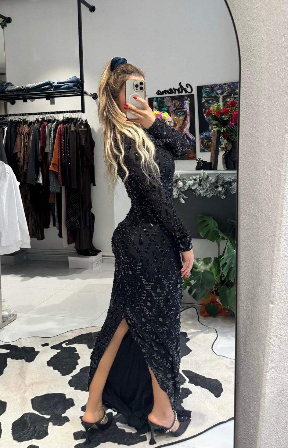 • Υφή & Διαφάνεια: Το σώμα του φορέματος είναι πλήρως φοδραρισμένο για άψογη εφαρμογή και κάλυψη. Τα μακριά μανίκια διαθέτουν διαφάνεια πάνω στην οποία είναι κεντημένες οι παγιέτες, προσφέροντας ένα σέξι, αέρινο αποτέλεσμα.