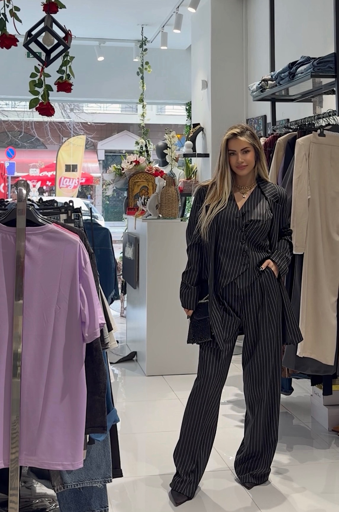 Αυτό το διαχρονικό σετ τριών τεμαχίων συνδυάζει την κλασική γοητεία του pinstripe σχεδίου με μια σύγχρονη, δυναμική γραμμή. Αποτελείται από: