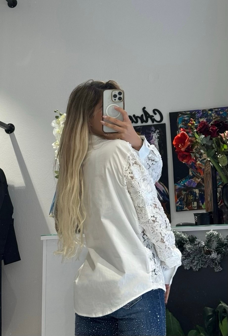 • Πίσω Όψη & Μανίκια: Η πίσω πλευρά του πουκαμίσου είναι από μονόχρωμο λευκό ποπλίνα για άνεση και καλύτερη εφαρμογή, δημιουργώντας μια μοντέρνα αντίθεση με τα δαντελένια μανίκια.