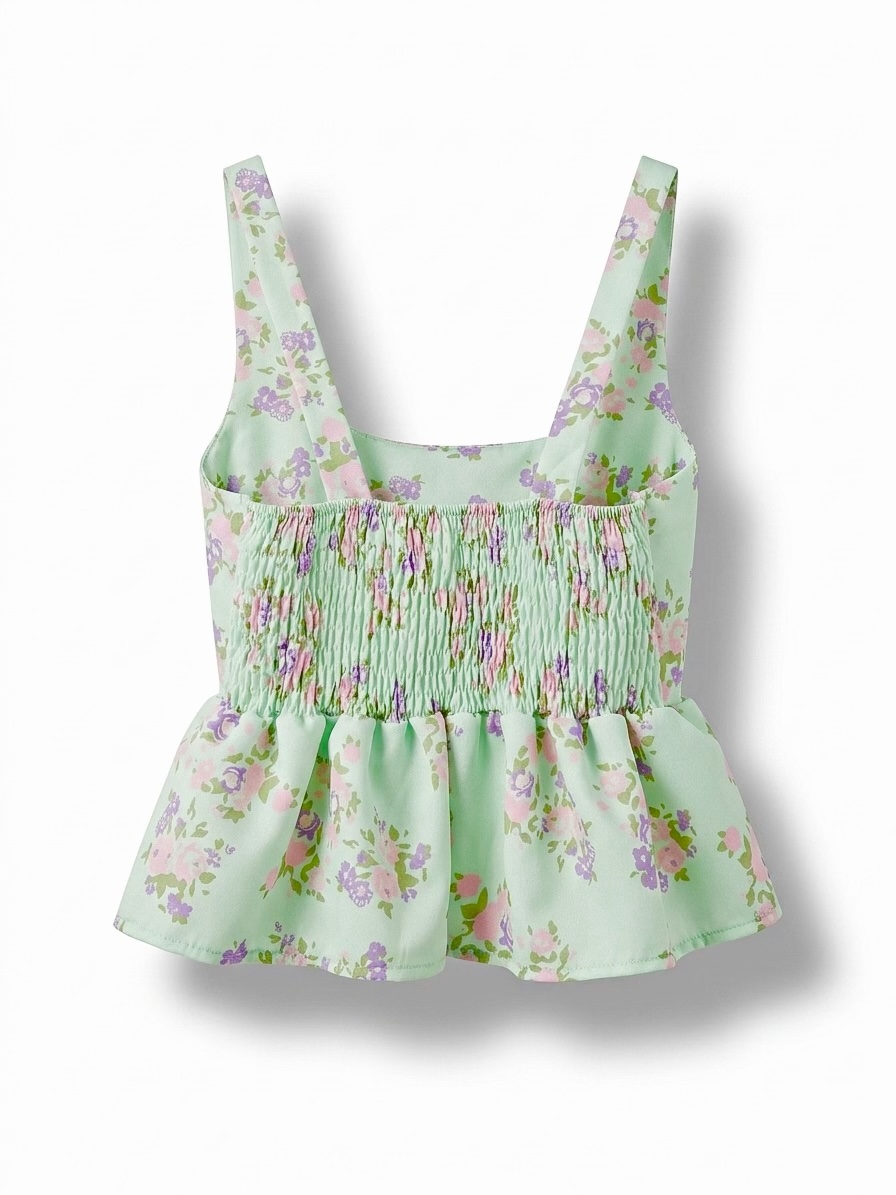 • Τοπ σε στυλ κορσέ: Διαθέτει σταθερές τιράντες και τετράγωνη λαιμόκοψη που αναδεικνύει το μπούστο. Η λεπτομέρεια με το βολάν στη μέση προσθέτει κίνηση και σμιλεύει τη σιλουέτα.