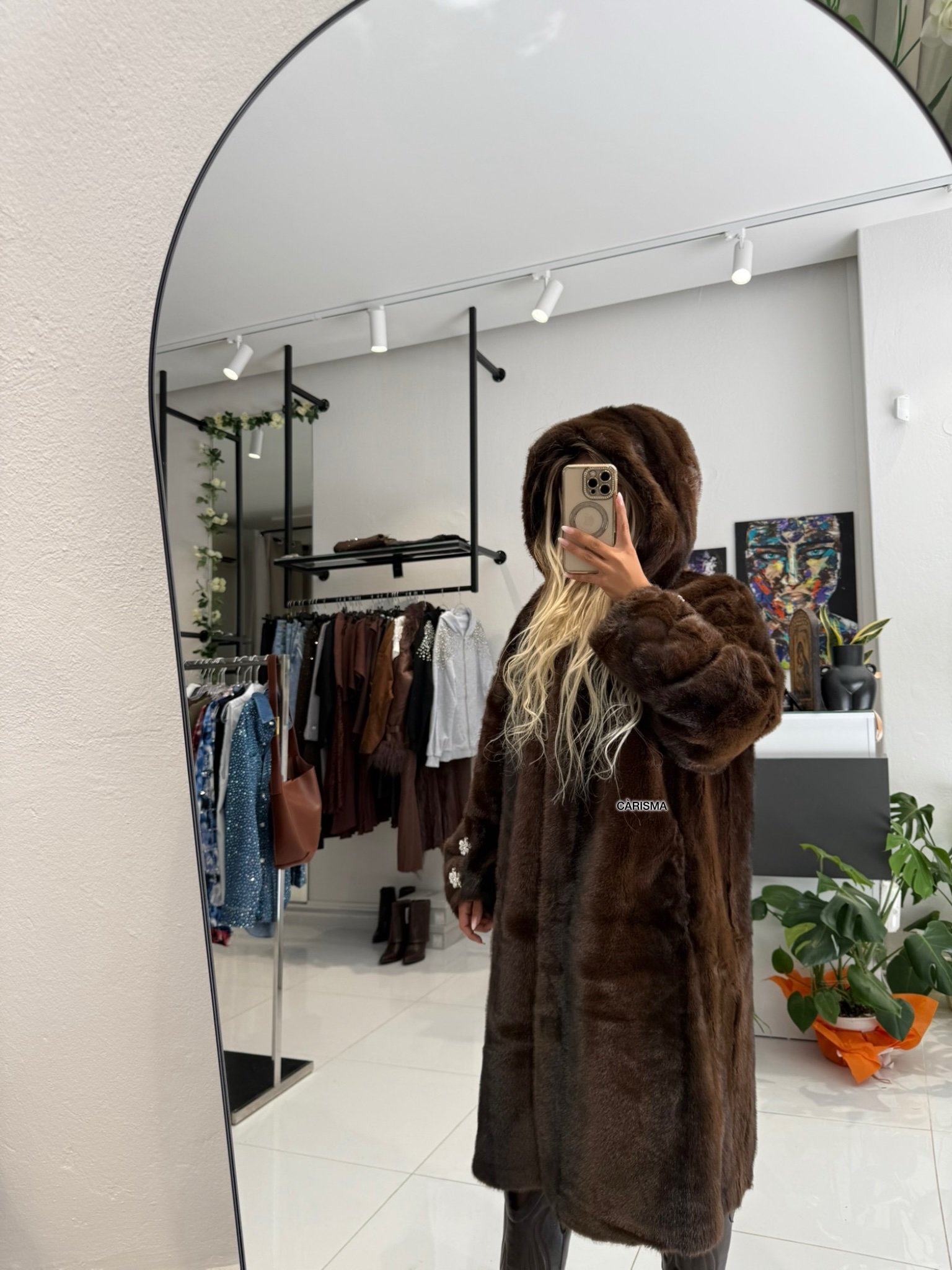 Η γούνα που ξεχωρίζει για τη ζεστασιά και την κομψότητά της. Μακρύ παλτό σε βαθύ σοκολατί τόνο, με απαλή, πλούσια τρίχα και κρυστάλλινες λεπτομέρειες που χαρίζουν διακριτική λάμψη.