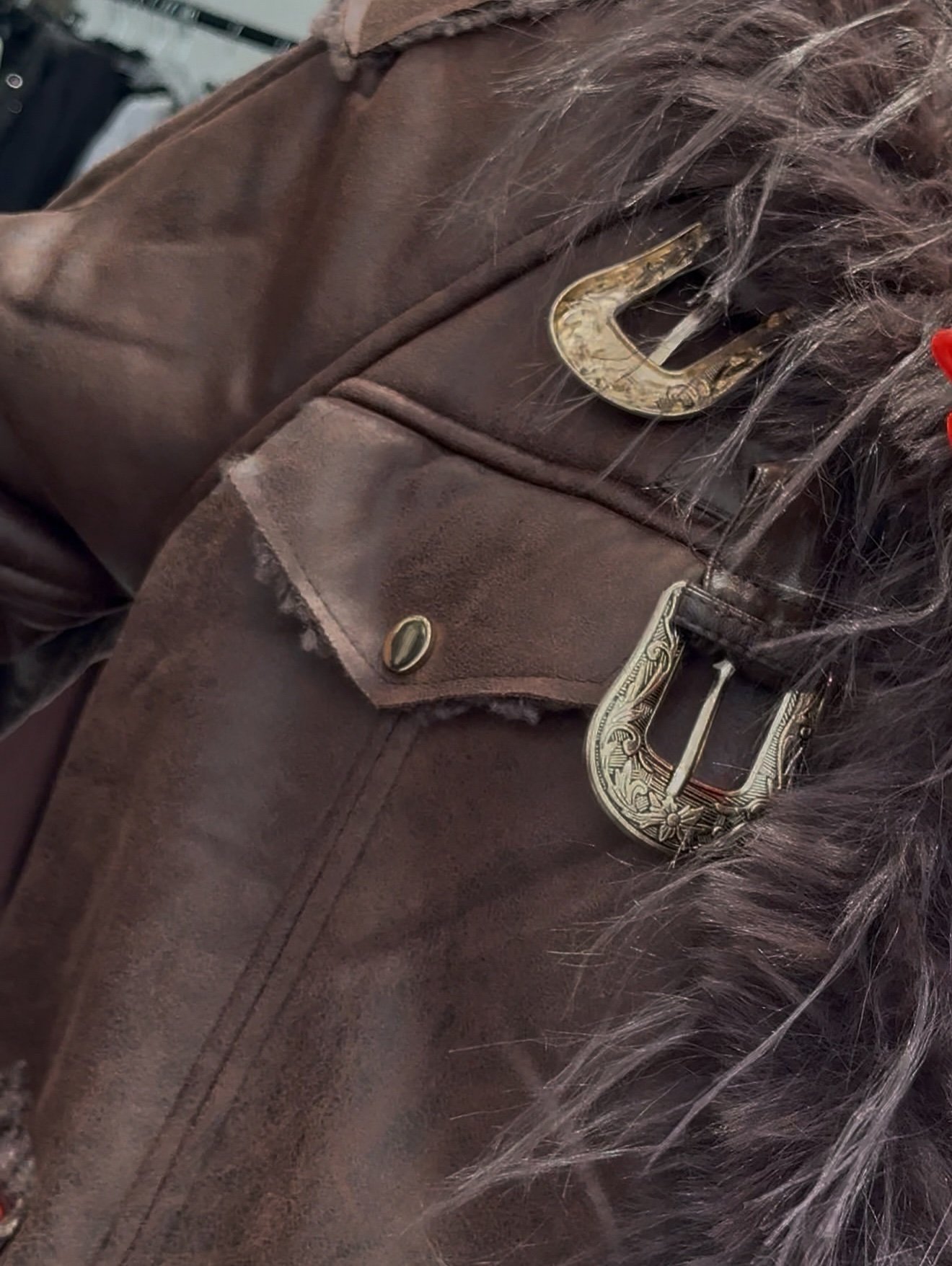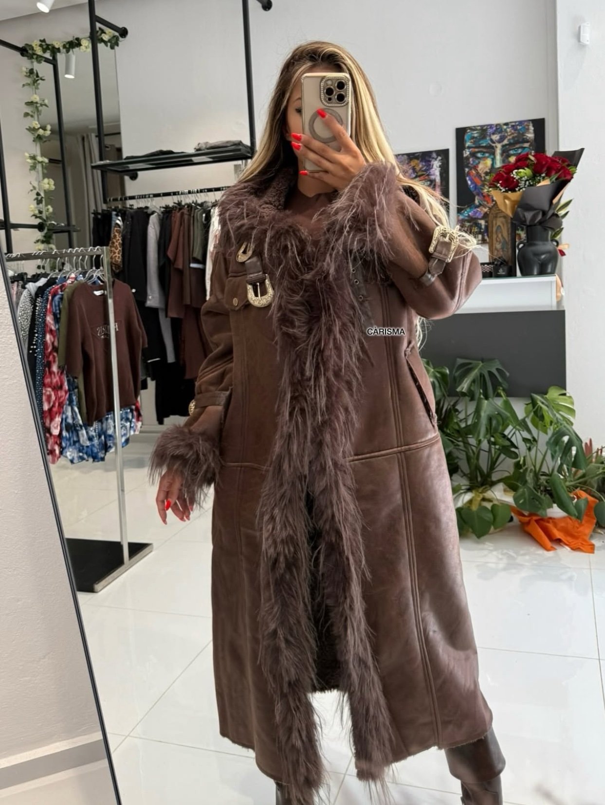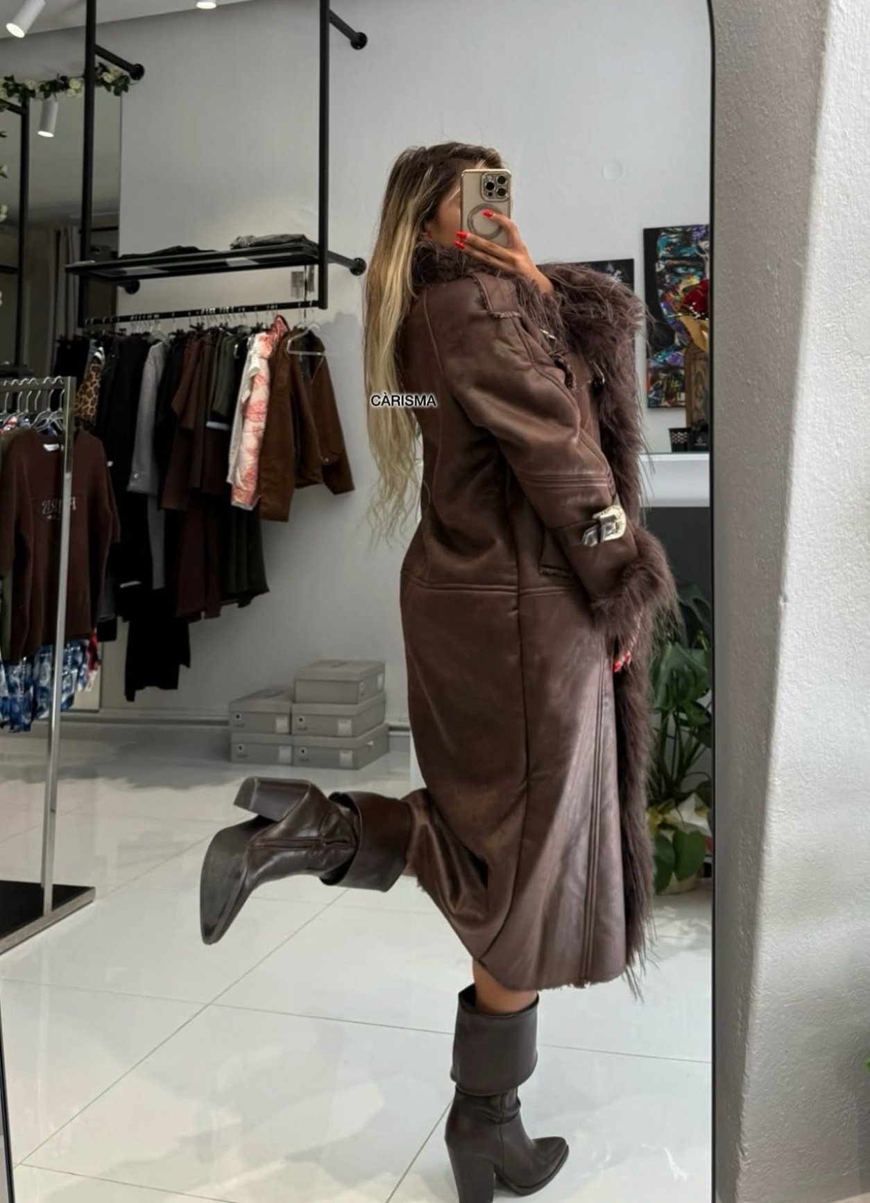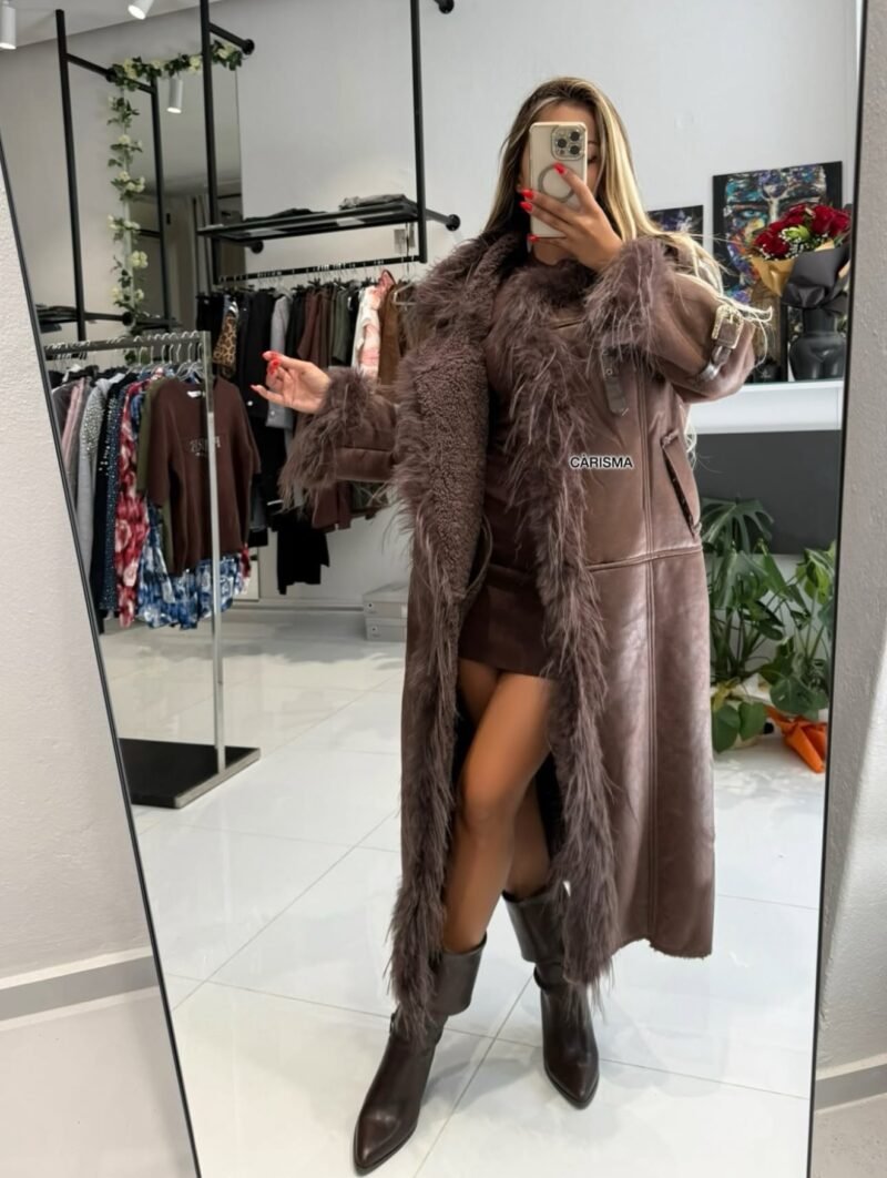 Το απόλυτο statement της σεζόν. Το Furenzia έρχεται σε βαθύ καφέ σοκολά, συνδυάζοντας την πολυτέλεια του δερμάτινου look με την άνεση μιας εσωτερικής επένδυσης από απαλό shearling – σαν προβατάκι – που χαρίζει αξεπέραστη ζεστασιά. Οι χρυσές λεπτομέρειες-ζωνάκια στα μανίκια και κάτω από τον λαιμό προσθέτουν λαμπερή αντίθεση, αναδεικνύοντας τη σοφιστικέ γοητεία του.
