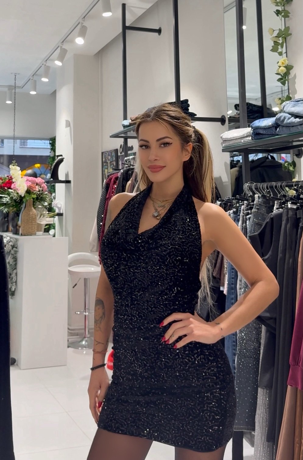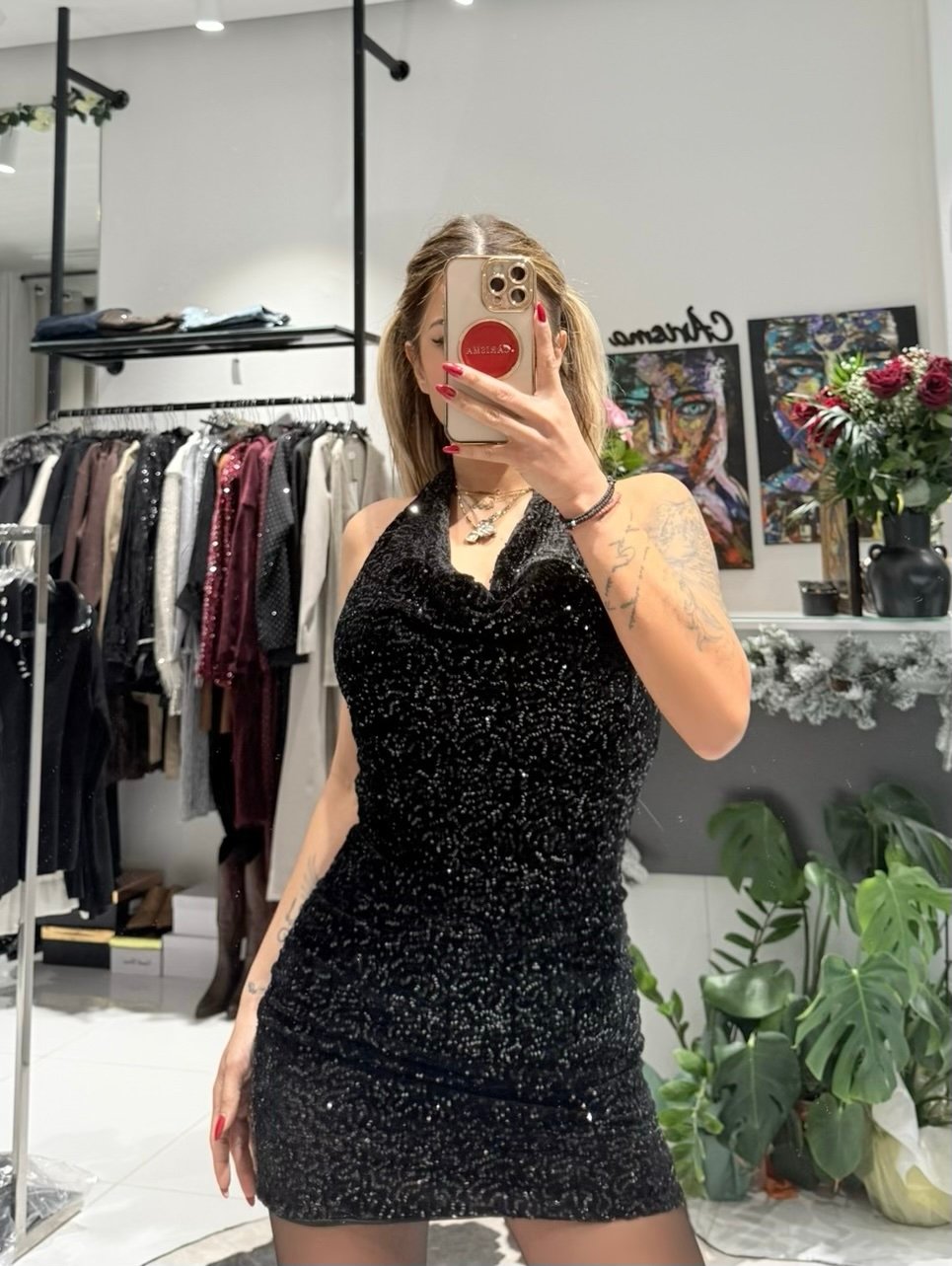 Εντυπωσιακό μίνι φόρεμα από ολόσωμη παγιέτα με ντραπέ λαιμόκοψη και εφαρμοστή γραμμή. Αμάνικο.