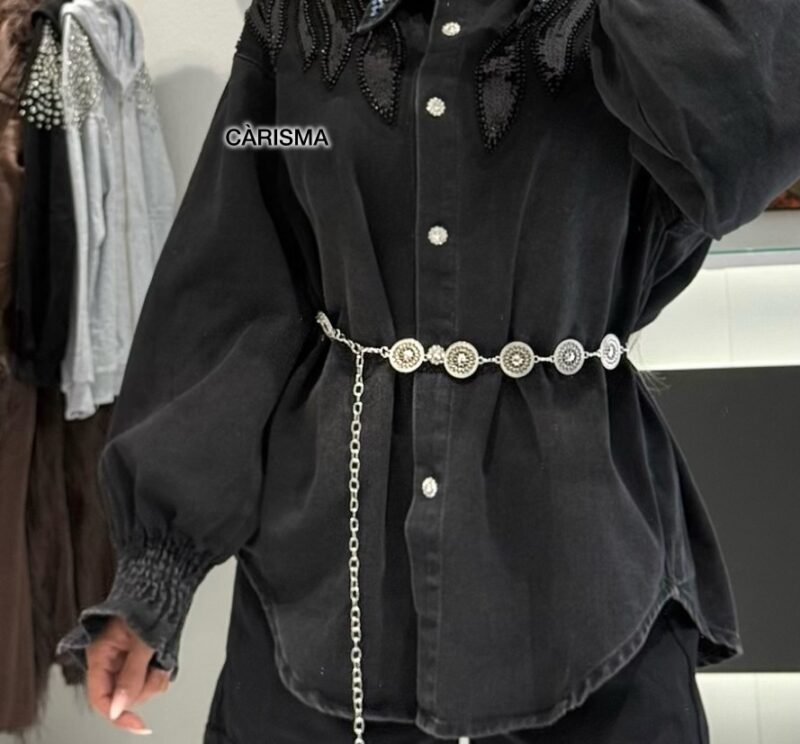 Η Gelly Belt είναι η αλυσίδα-ζώνη που μεταμορφώνει κάθε look. Κατασκευασμένη από μεταλλικούς συνδέσμους σε ασημί τόνους και διακοσμημένη με κυκλικά μοτίβα που θυμίζουν vintage κοσμήματα, δίνει άμεσα λάμψη και χαρακτήρα. Ρυθμιζόμενη για τέλεια εφαρμογή, μπορεί να φορεθεί στη μέση πάνω από πουκάμισα, φορέματα ή παντελόνια, αλλά και χαμηλά στη λεκάνη για πιο boho αισθητική. Ένα κομμάτι–κλειδί που αναβαθμίζει από το πρωινό casual outfit έως το βραδινό glam look.