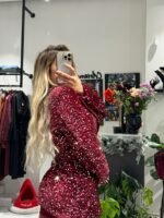 • Χρώμα & Υφή: Το βαθύ μπορντό χρώμα προσδίδει έναν τόνο πολυτέλειας και μυστηρίου, ενώ οι διάσπαρτες ασημί παγιέτες εξασφαλίζουν το διακριτικό, σπινθηροβόλο αποτέλεσμα του “glimmer”.