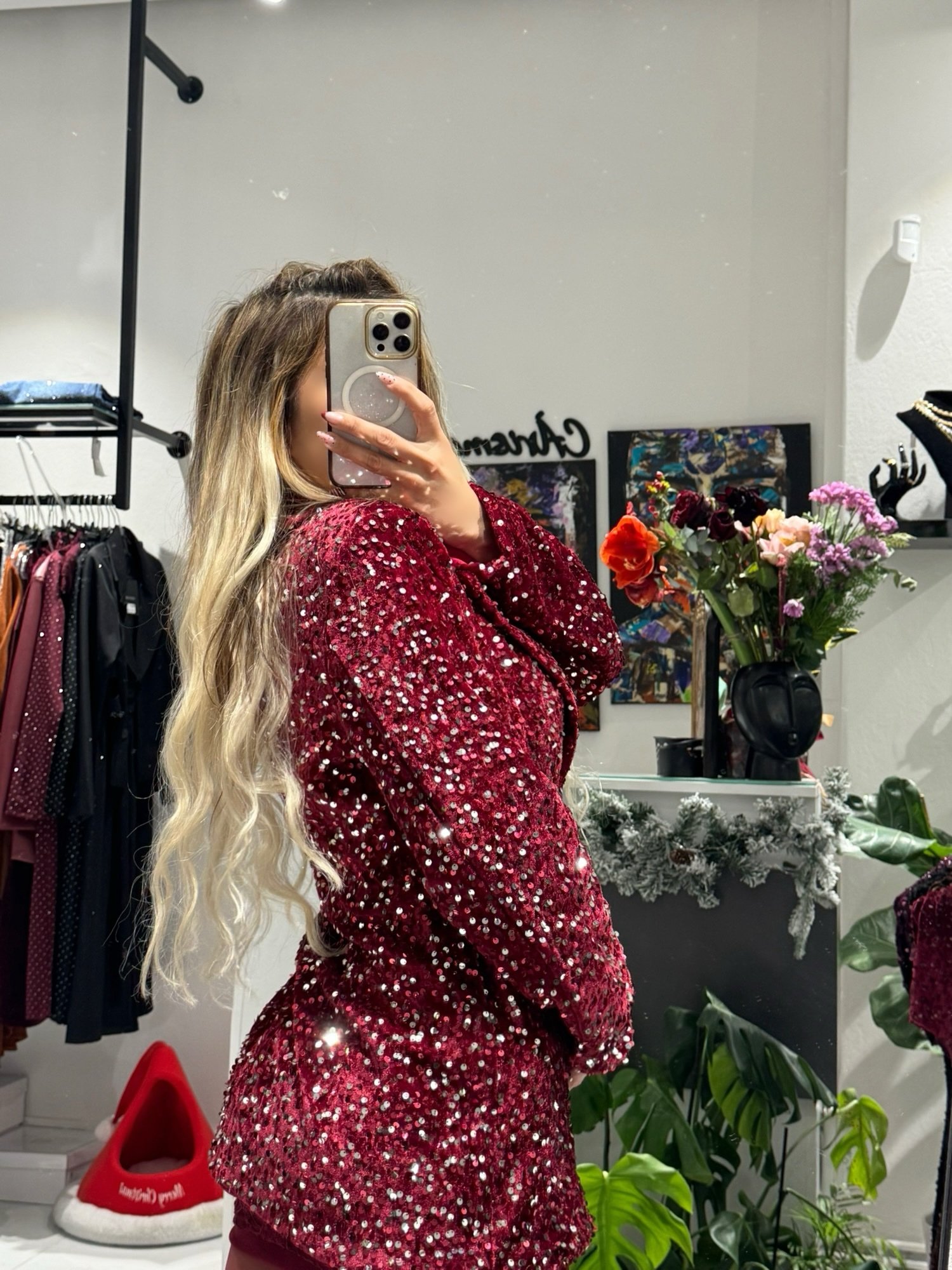 Το Glimmer Blazer είναι το statement κομμάτι που προσδίδει άμεση αίγλη και εκλεπτυσμένη λάμψη σε κάθε σας εμφάνιση. Φτιαγμένο για να αιχμαλωτίζει το βλέμμα, καλύπτεται εξ ολοκλήρου από πυκνές μπορντό και ασημί παγιέτες, οι οποίες δημιουργούν ένα εκθαμβωτικό εφέ.