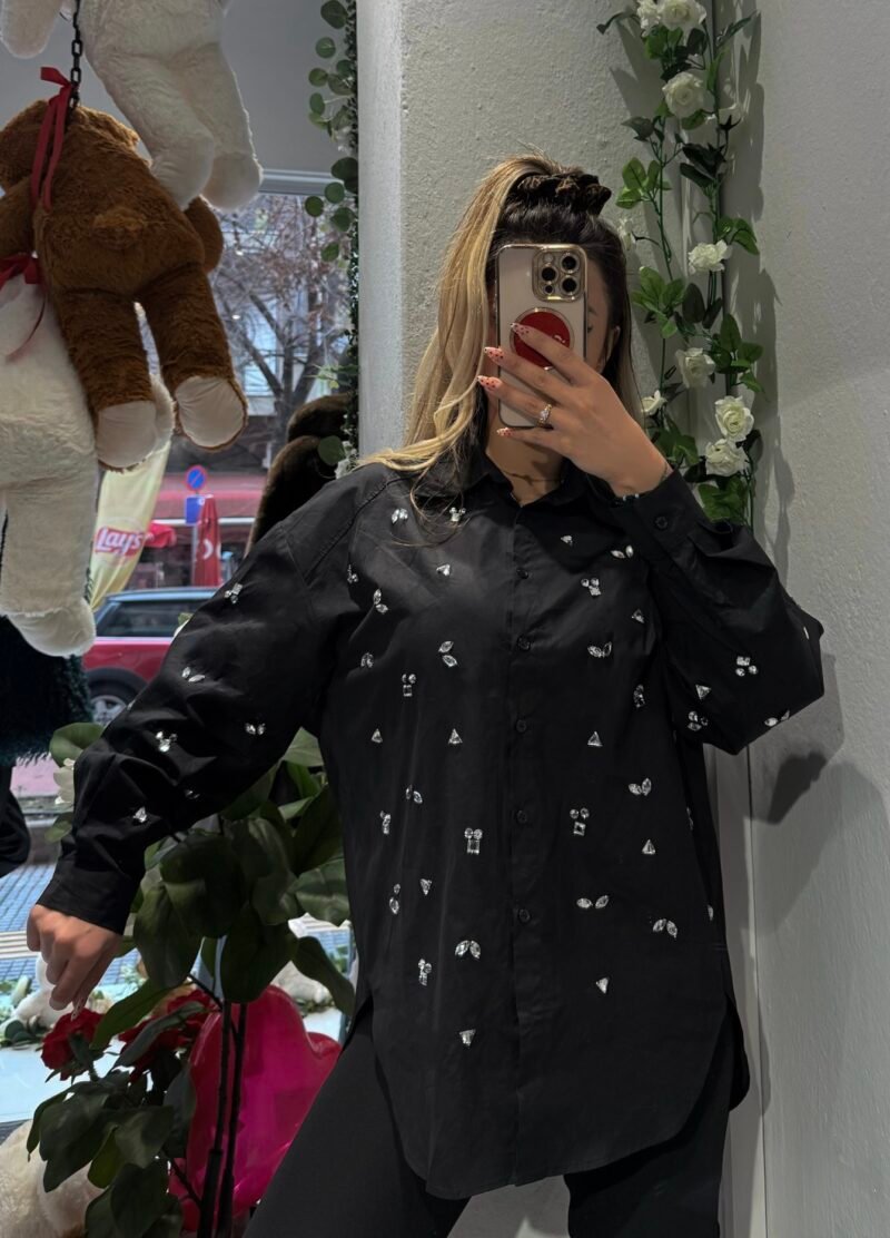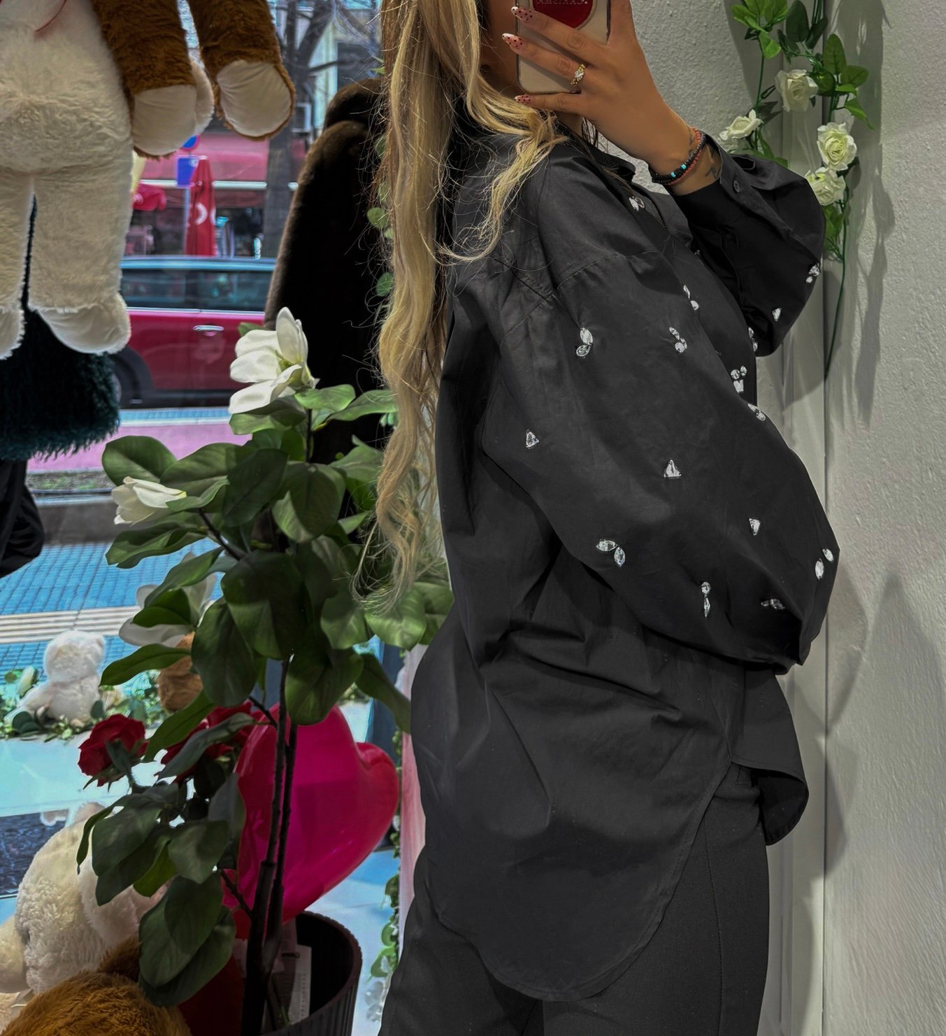 Αναβαθμίστε την γκαρνταρόμπα σας με το πουκάμισο Glow, ένα κομμάτι που συνδυάζει την κλασική γραμμή με την πολυτέλεια. Σε διαχρονικό μαύρο χρώμα, διακοσμημένο με διάσπαρτα κρύσταλλα που αντανακλούν το φως, είναι η ιδανική επιλογή για εμφανίσεις που θέλουν να ξεχωρίζουν χωρίς προσπάθεια.