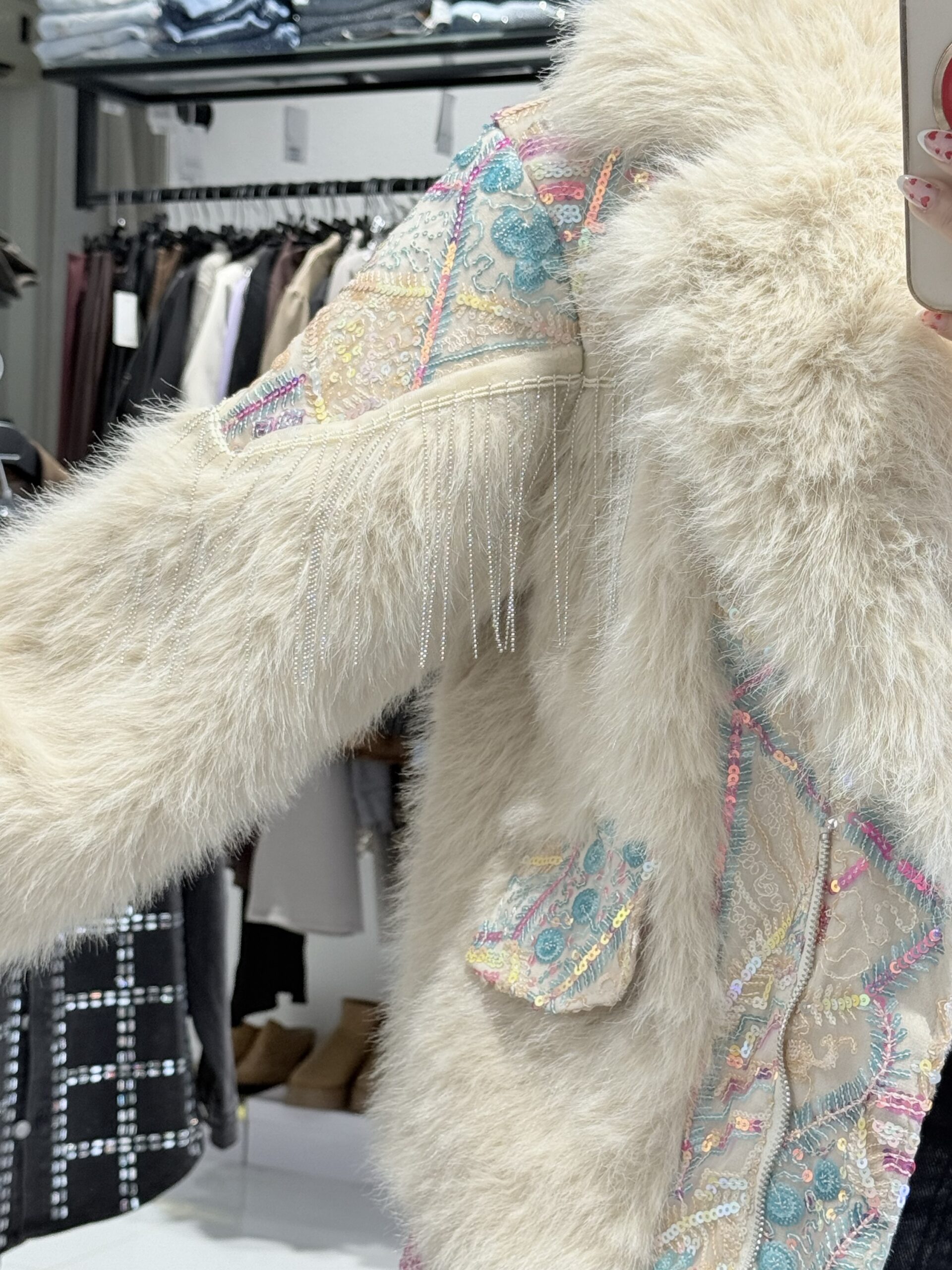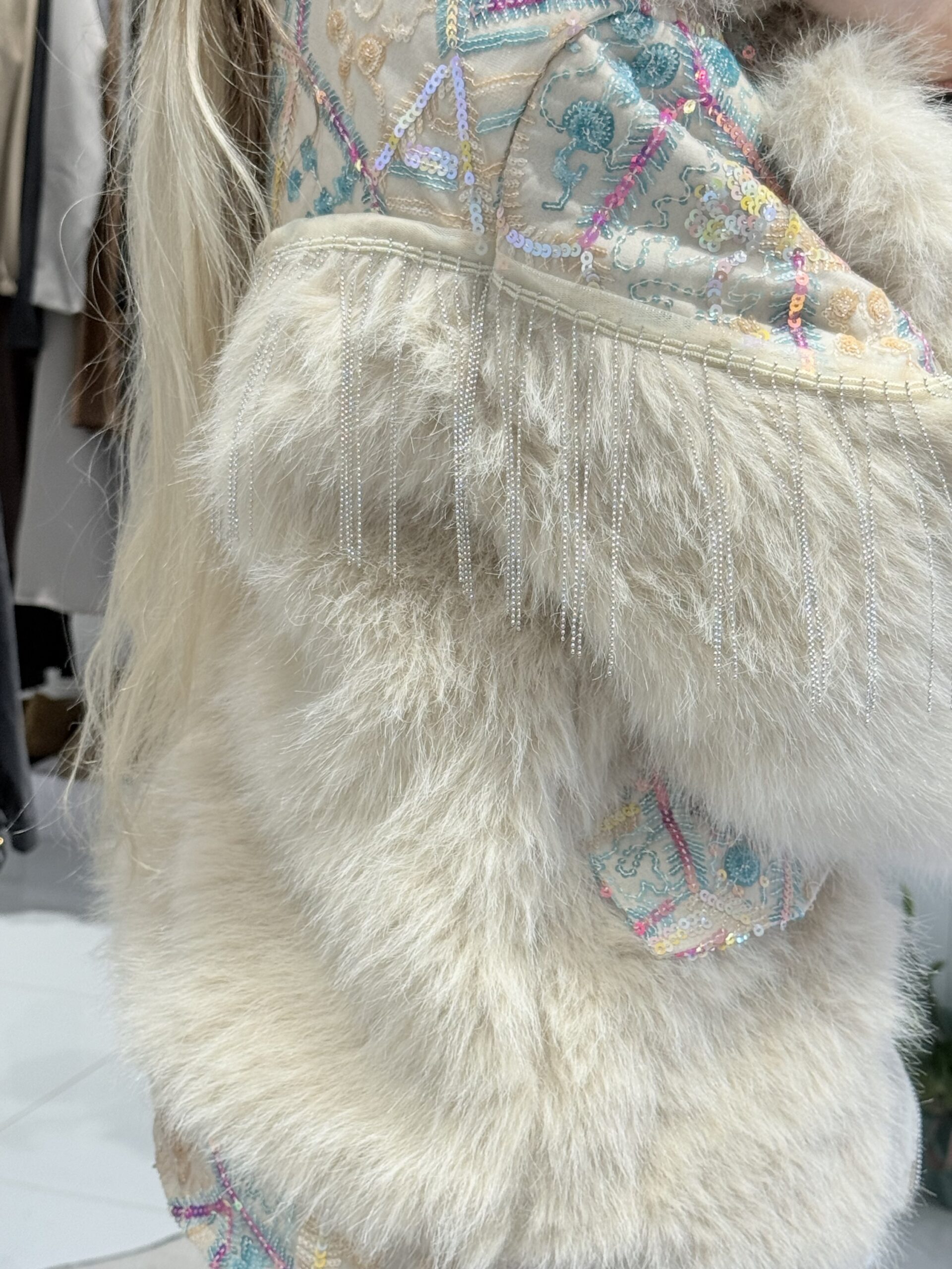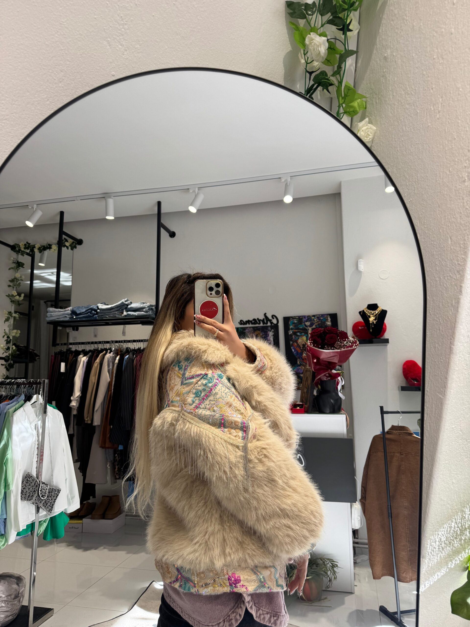 Το Indra δεν είναι απλώς ένα πανωφόρι, είναι μια εμπειρία στυλ. Αυτό το premium κομμάτι παντρεύει την πλούσια υφή της faux γούνας με την τέχνη του bohemian κεντήματος. Οι λαμπερές παγιέτες σχηματίζουν περίτεχνα μοτίβα πάνω σε μια nude βάση, ενώ οι διακριτικές αλυσίδες-κρόσσια στους ώμους προσδίδουν μια “rock-glam” κίνηση σε κάθε σας βήμα.