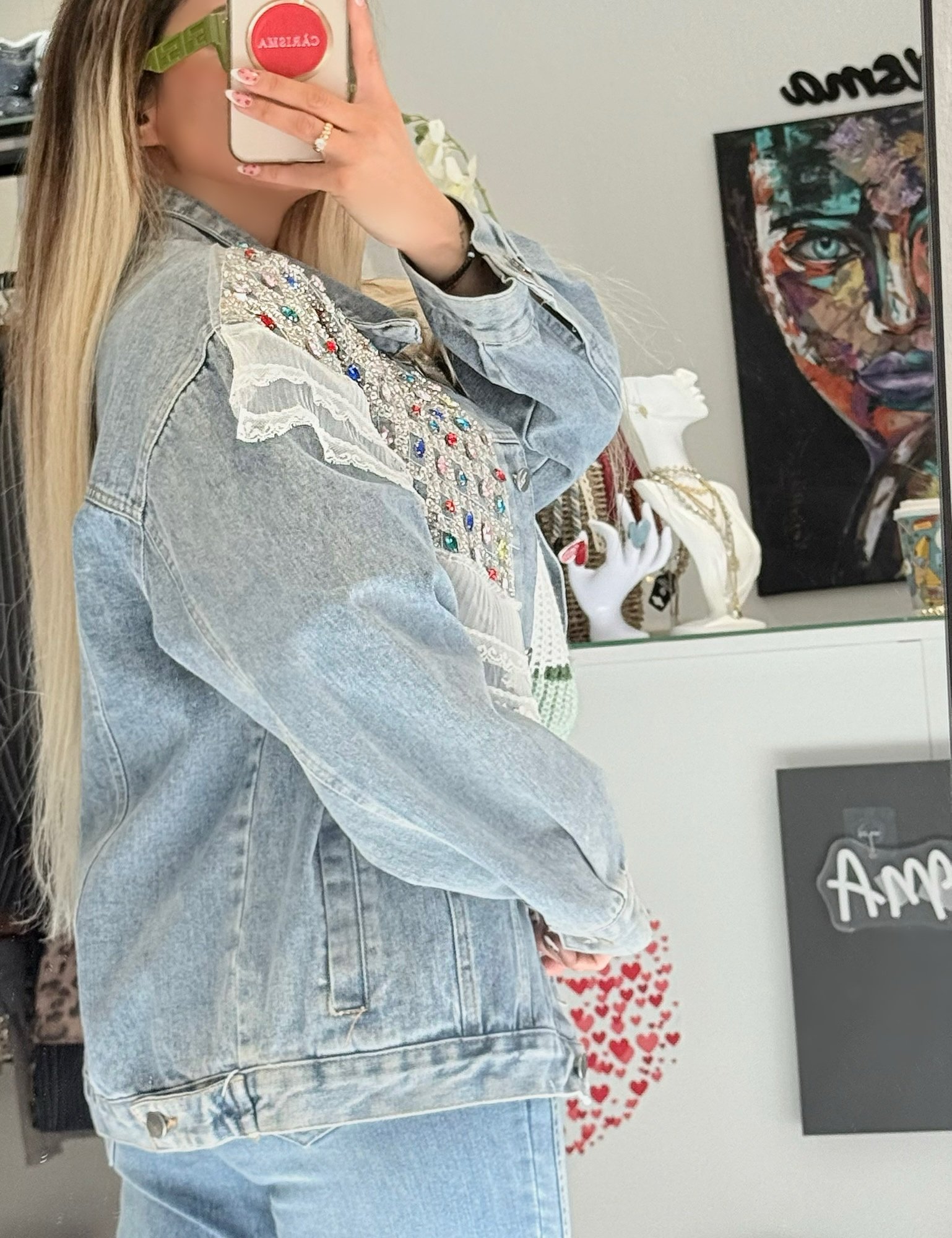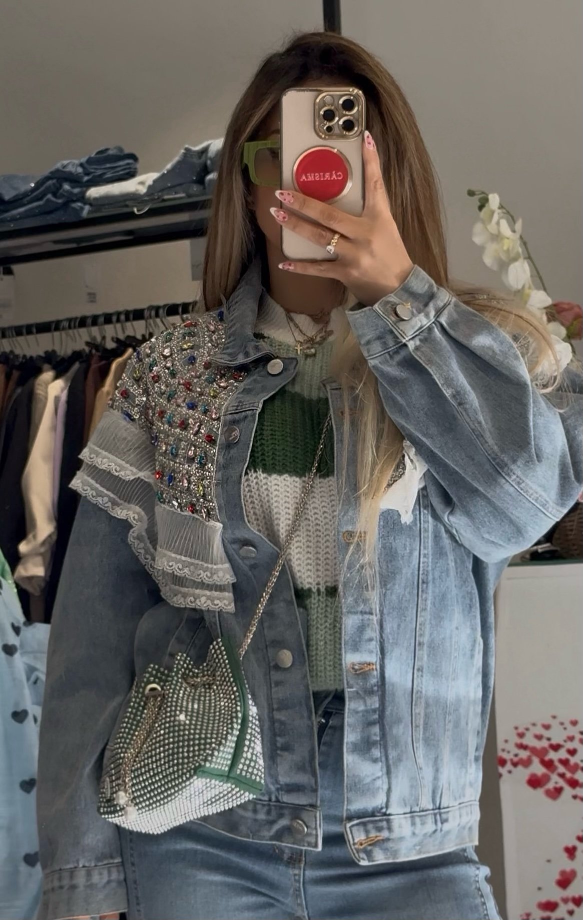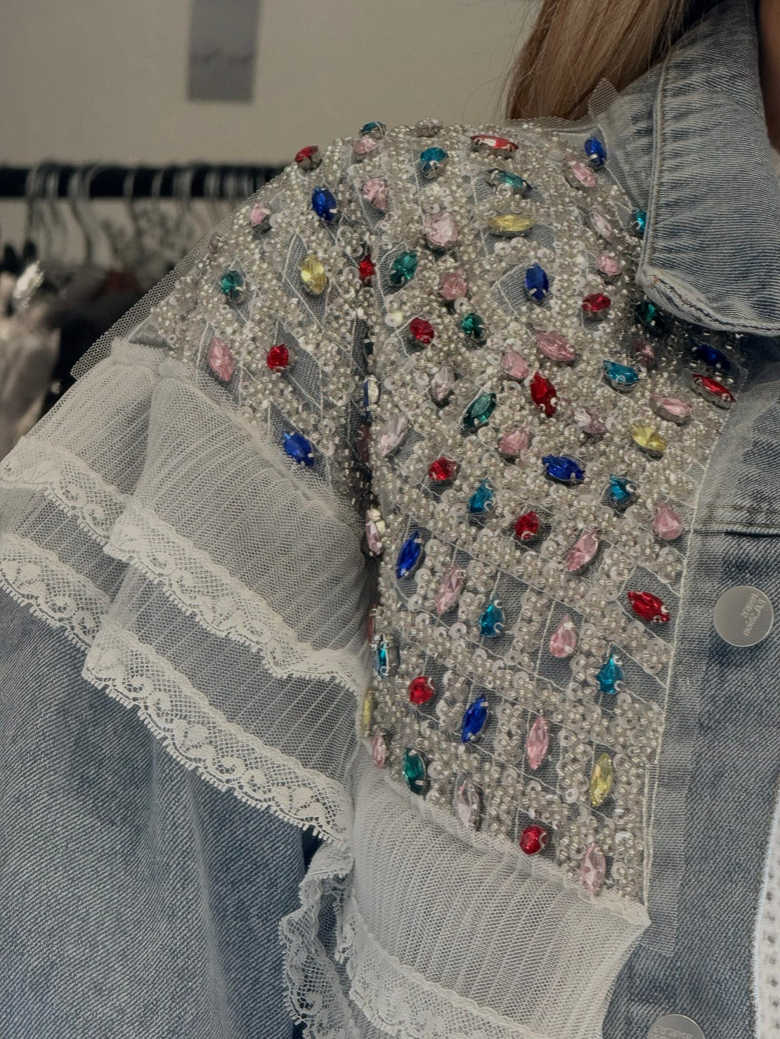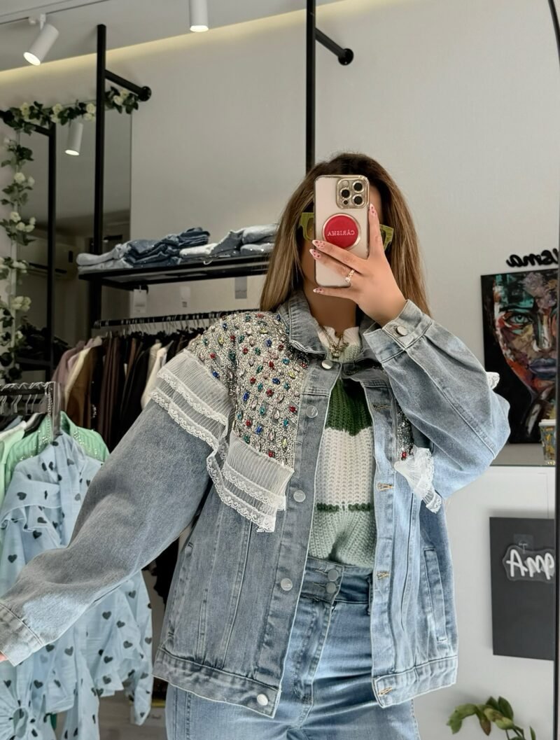 Για ένα απόλυτα ολοκληρωμένο και luxury look, συνδυάστε το με το αντίστοιχο τζιν παντελόνι Isméria. Οι πέτρες και οι παγιέτες στο τελείωμα του παντελονιού δημιουργούν μια ομοιόμορφη “συνέχεια” λάμψης, ιδανική για glam εμφανίσεις από το πρωί έως το βράδυ.