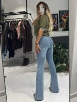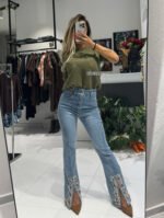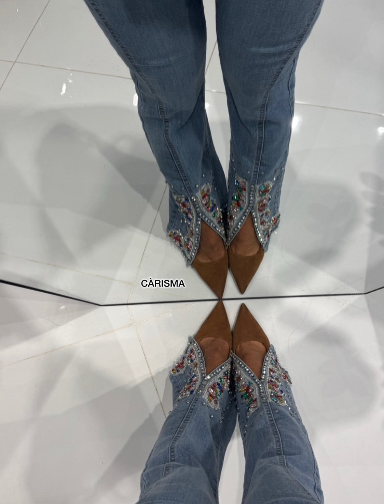 Ψηλόμεσο denim σε γραμμή που αγκαλιάζει το σώμα και ανοίγει διακριτικά στο τελείωμα, στολισμένο με χειροποίητες λεπτομέρειες από πολύχρωμες πέτρες και κεντήματα.