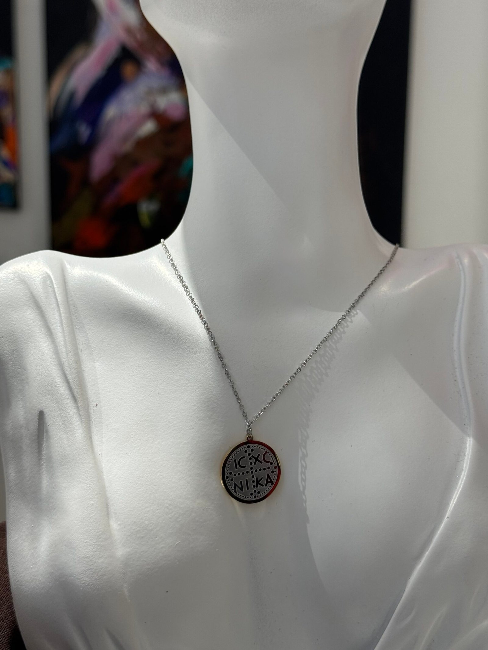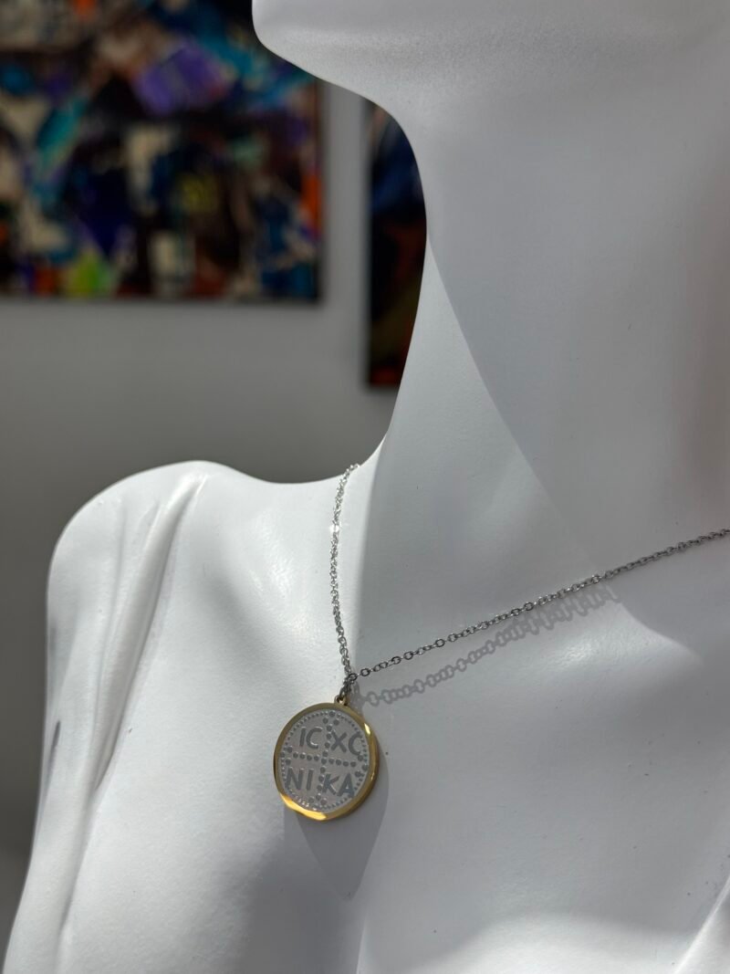 Το μενταγιόν φέρει το παραδοσιακό χριστιανικό σύμπλεγμα “IC XC NIKA”, το οποίο είναι το αρχαιότερο και πιο διαδεδομένο σύμβολο του Χριστιανισμού: