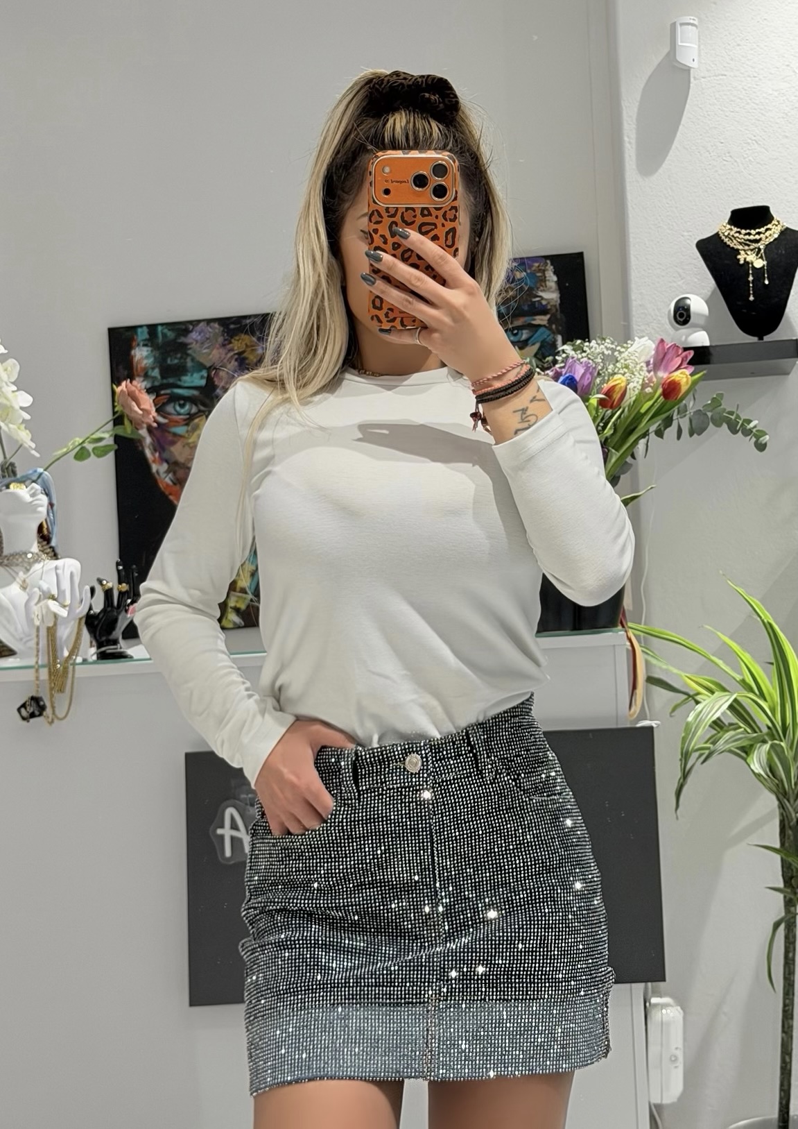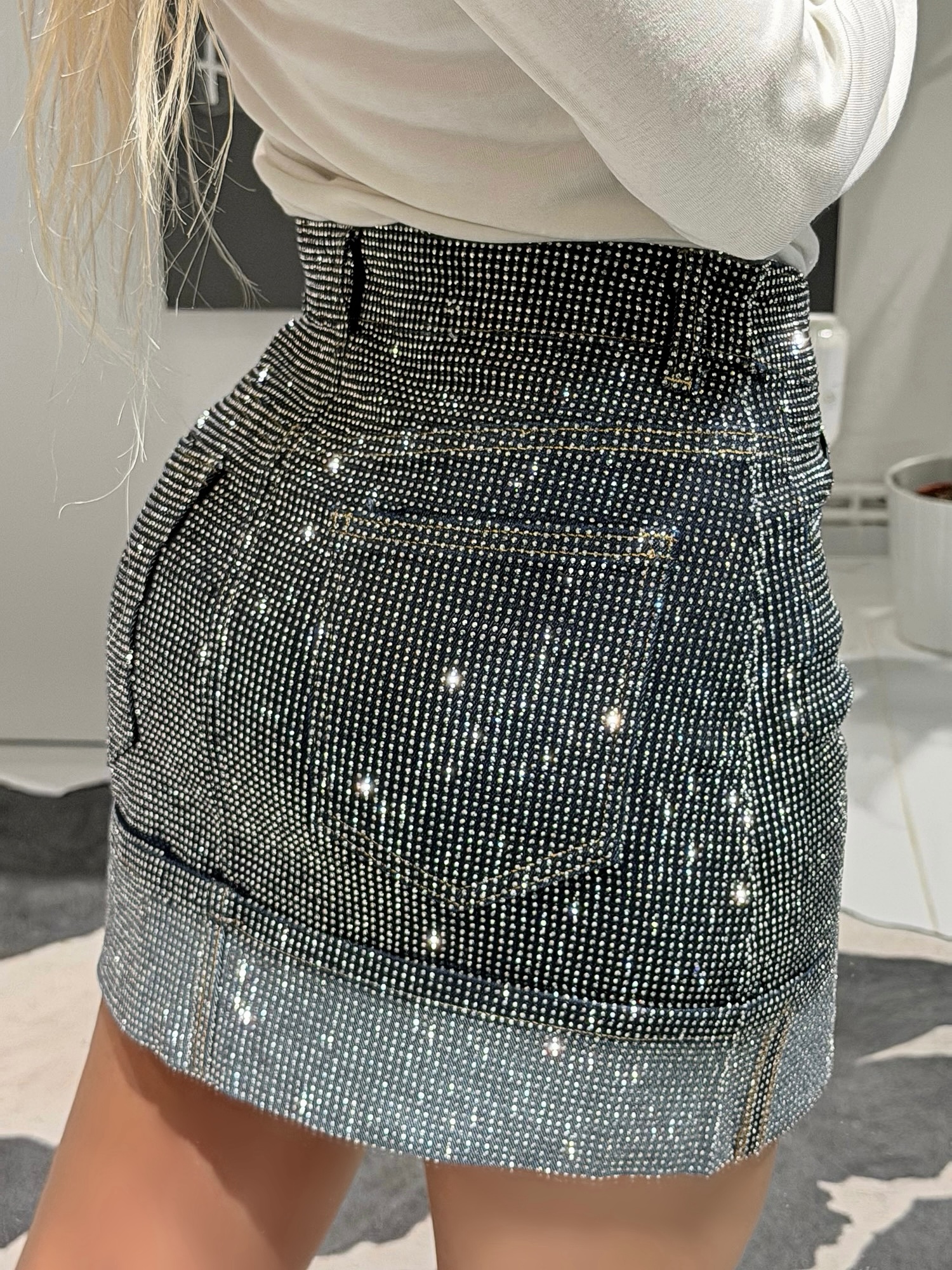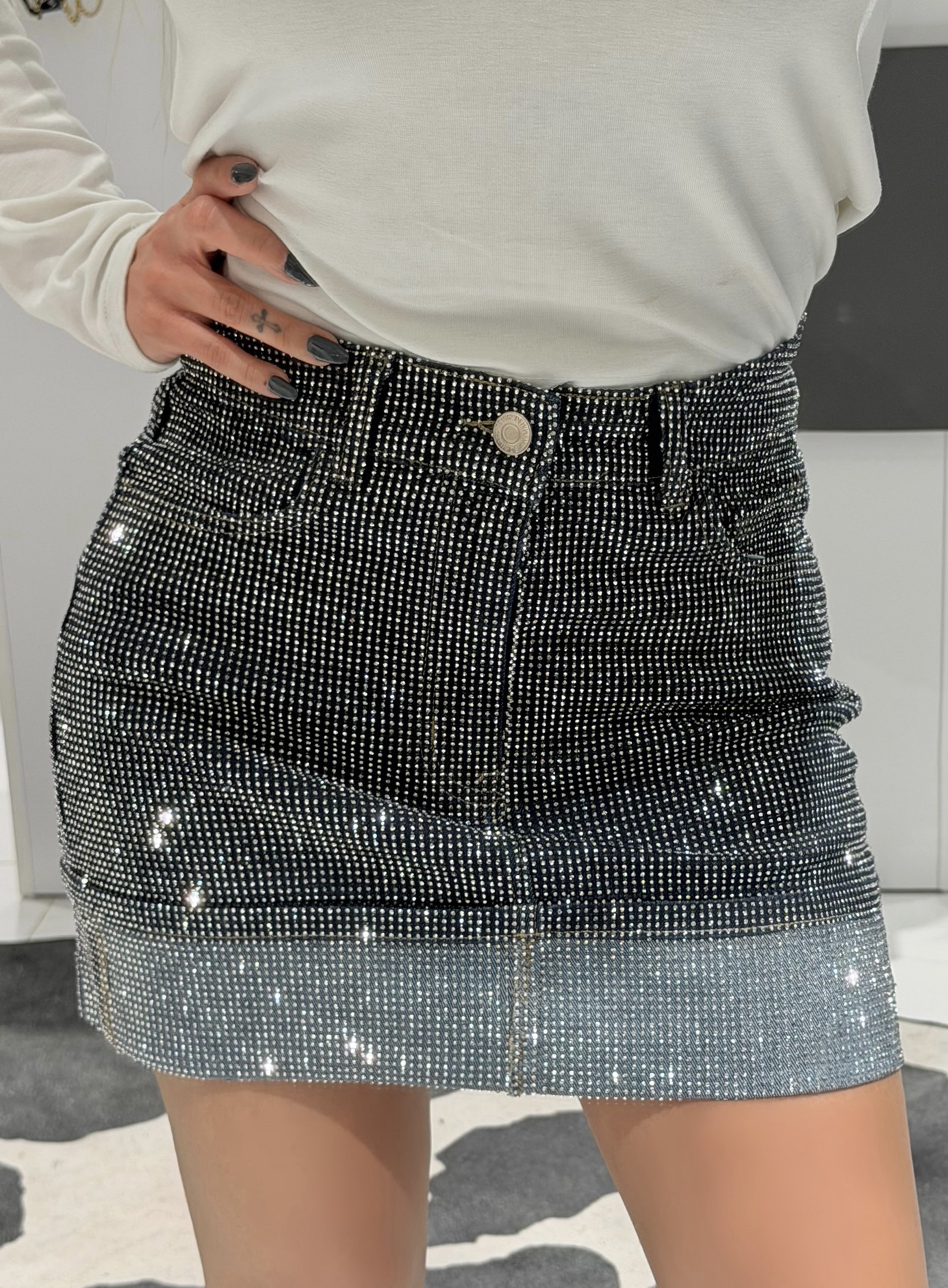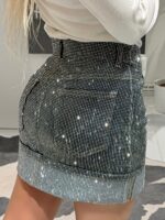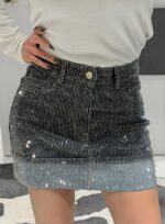 Αυτή η denim φούστα σε σκούρο μπλε χρώμα αναβαθμίζεται με μια εντυπωσιακή επικάλυψη από στραφταλιζέ πέτρες, προσφέροντας έναν αέρα πολυτέλειας στο outfit σας.