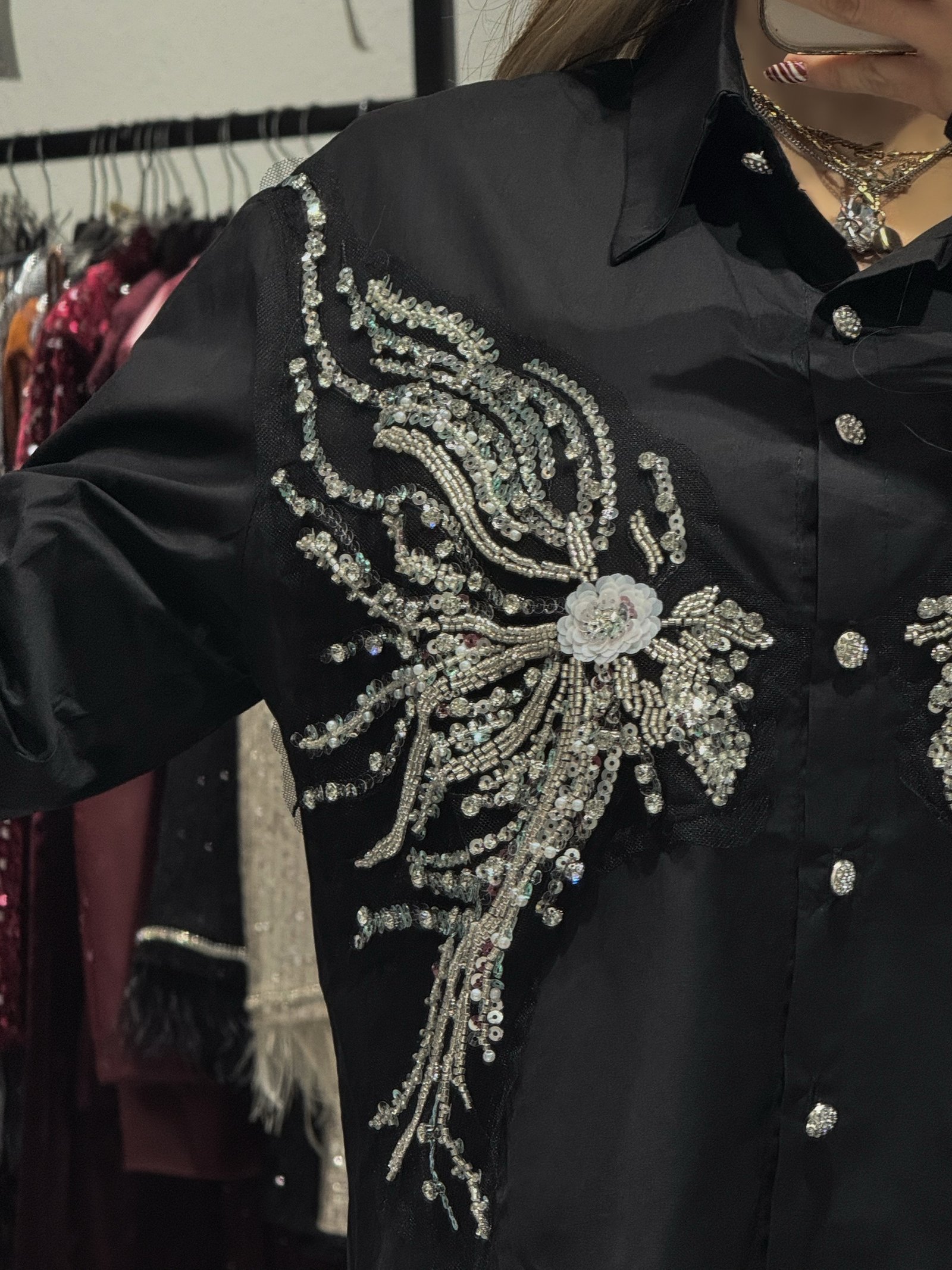 Το αγαπημένο σας σχέδιο επιστρέφει στην πιο luxury και δυναμική του εκδοχή! Το “Jewel” black edition είναι ένα πουκάμισο που συνδυάζει την απόλυτη κομψότητα του μαύρου με την εκθαμβωτική λάμψη των χειροποίητων λεπτομερειών.