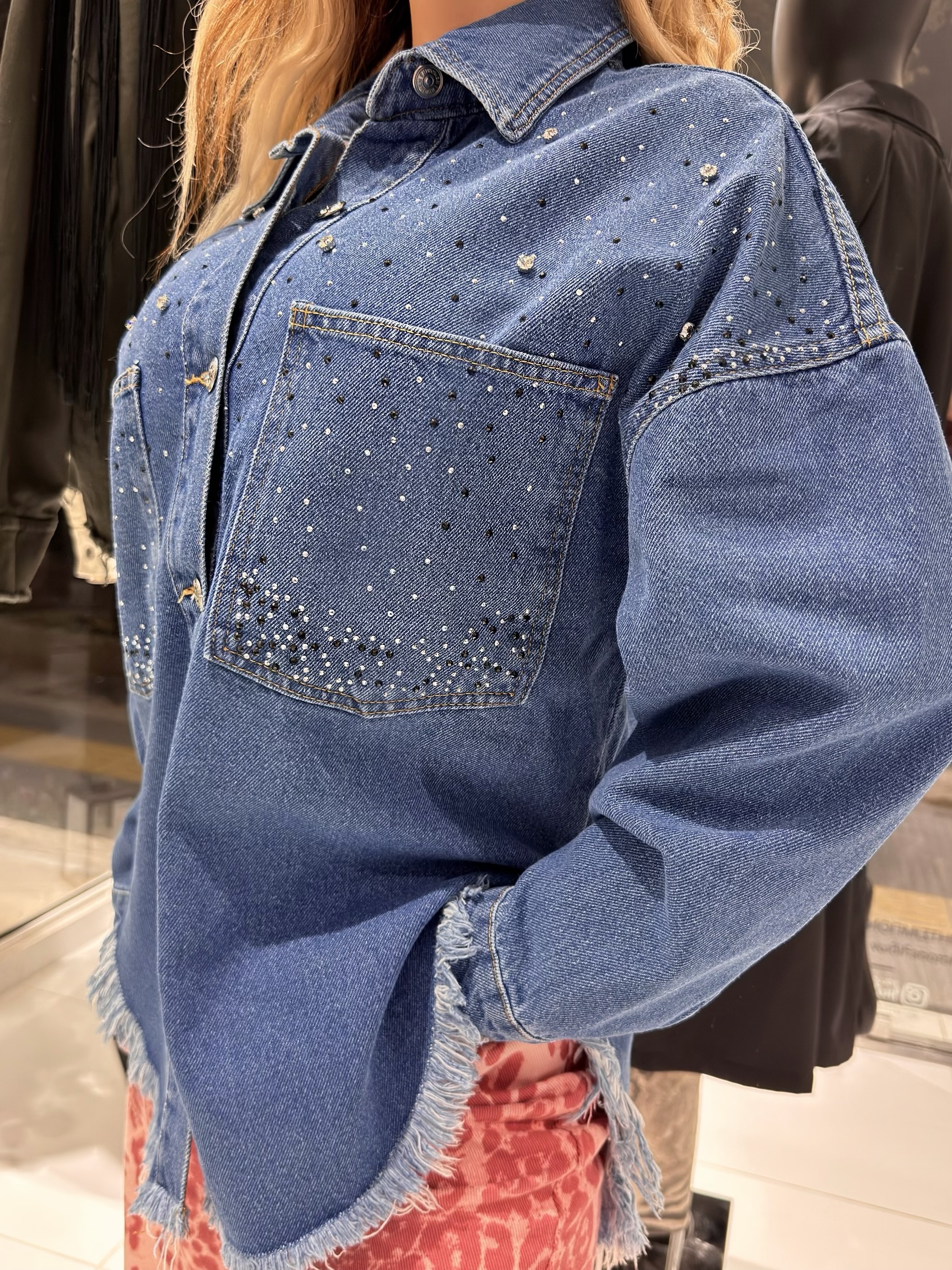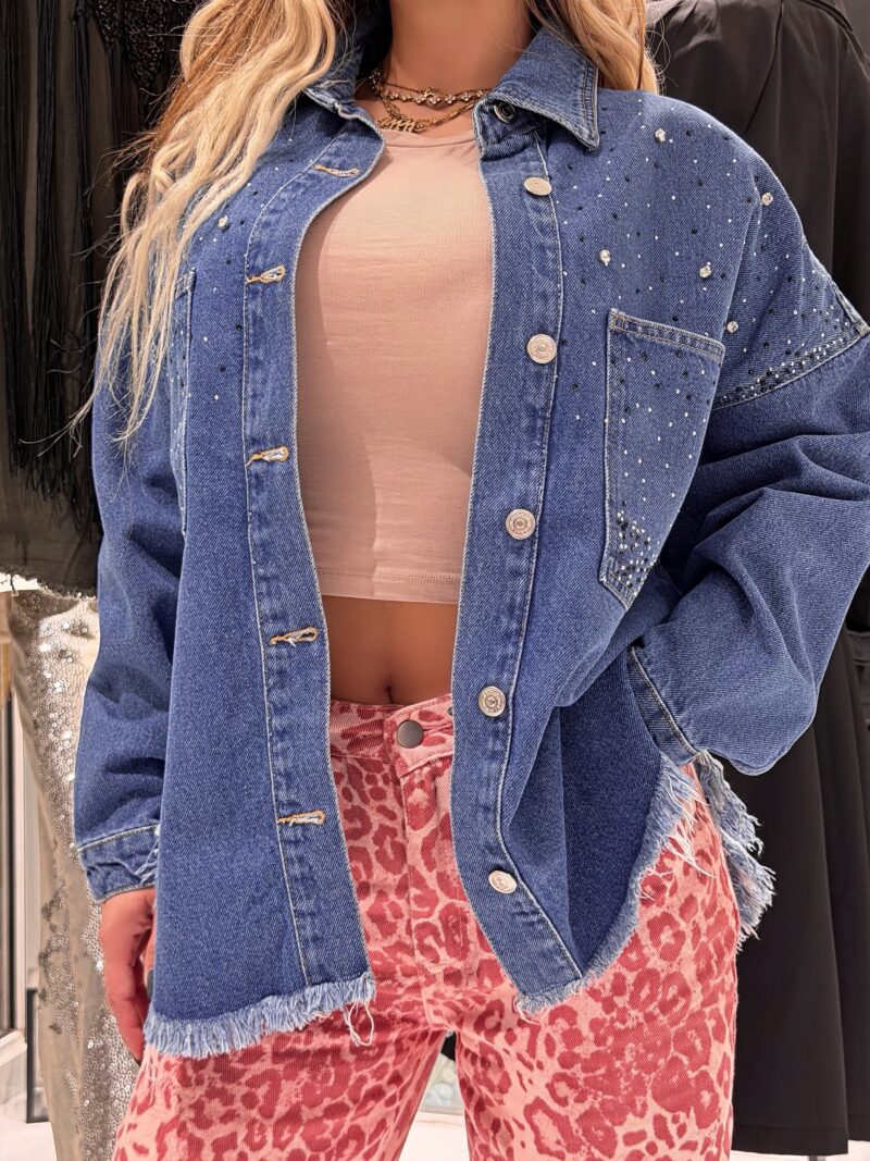 • Κλασικό Denim: Ποιοτικό μπλε τζιν με ασημί μεταλλικά κουμπιά και λειτουργικές τσέπες.