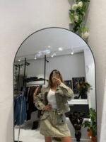 Denim υφή σε ανοιχτό washed-khaki τόνο με διακριτικό γκριζοπράσινο φινίρισμα και εντυπωσιακές τρουκ λεπτομέρειες που λάμπουν στο φως. Το cropped jacket και η mini φούστα με μεγάλες τσέπες συνδυάζουν άνεση και statement εμφάνιση – ιδανικά για day-to-night styling με sneakers ή μποτάκια. One size