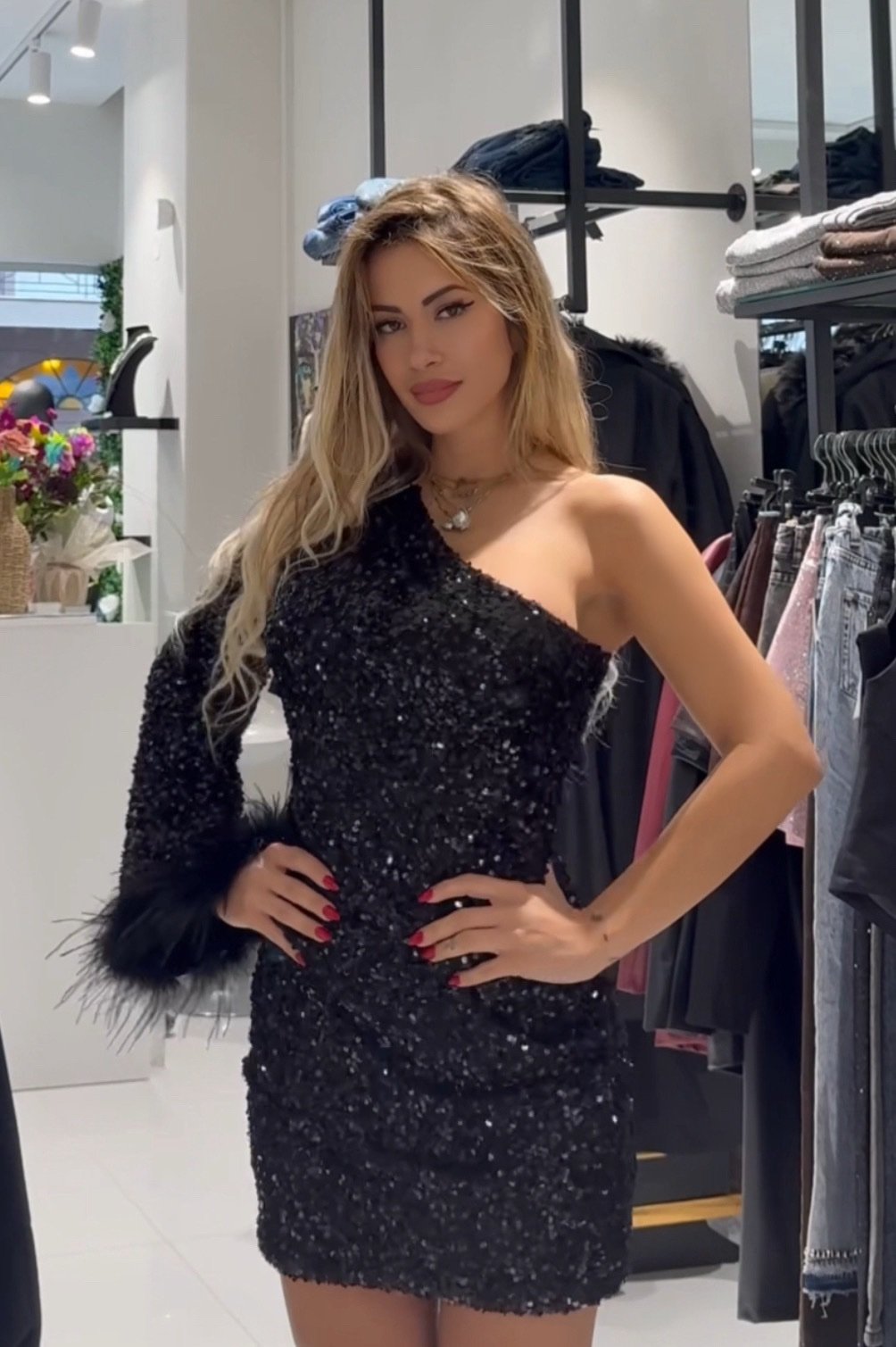 • Το Μανίκι: Το μακρύ μανίκι του φορέματος είναι επίσης καλυμμένο με παγιέτες και ξεχωρίζει χάρη στα μαύρα πούπουλα που κοσμούν το τελείωμά του, προσθέτοντας μια δραματική και θηλυκή πινελιά.
