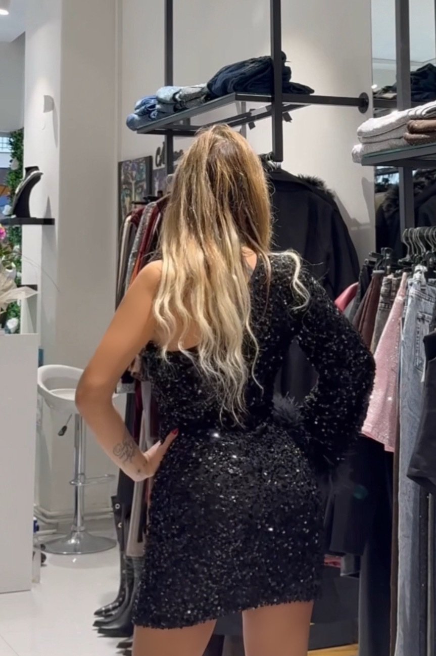 • Ύφασμα και Λεπτομέρειες: Είναι καλυμμένο εξολοκλήρου με μαύρες παγιέτες, προσδίδοντας μια εκθαμβωτική λάμψη που κεντρίζει τα βλέμματα.