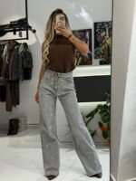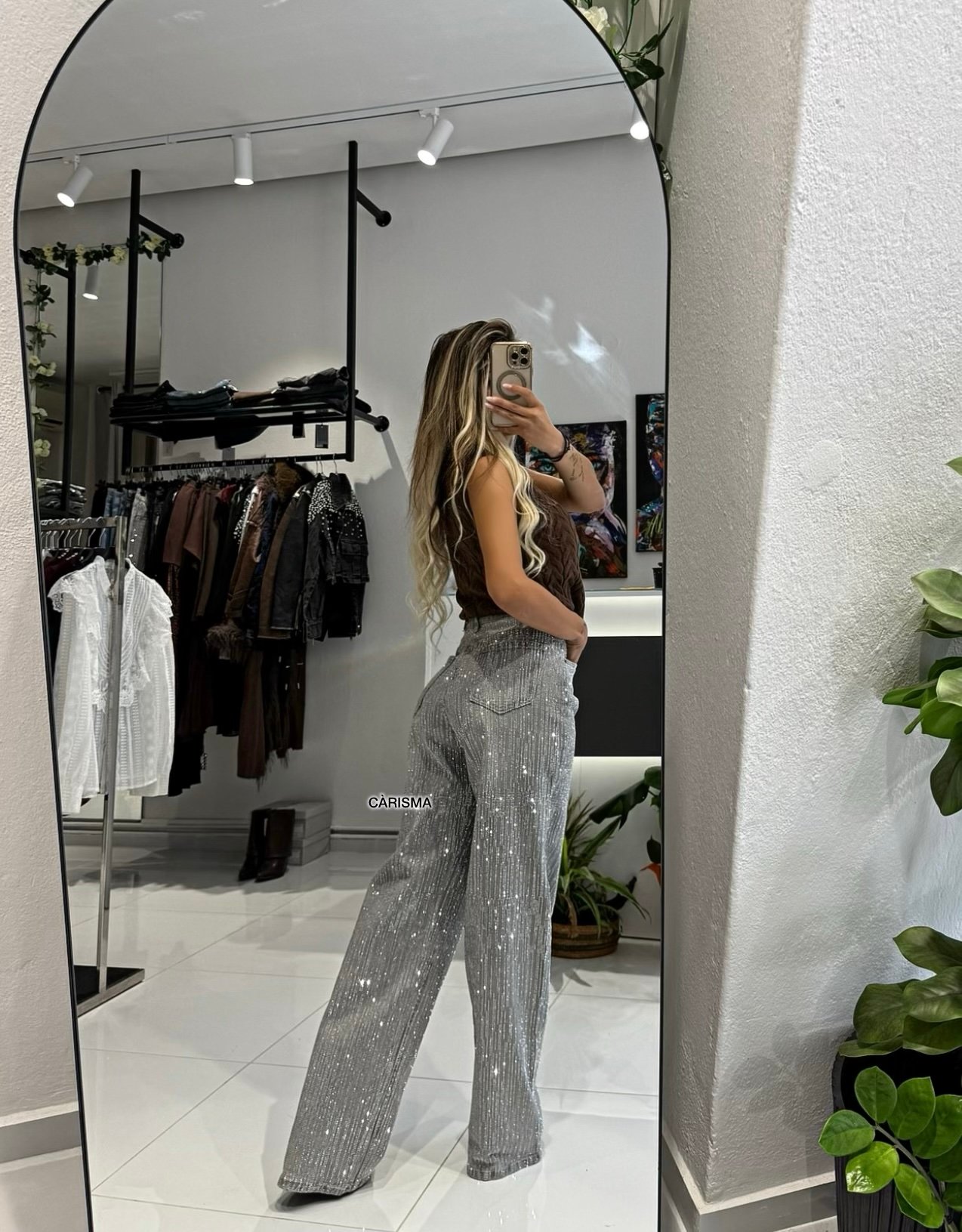 Το Layla είναι το wide-leg τζιν που κλέβει την παράσταση. Γκρι denim με στρας σαν ασημένια βροχή, μπροστά και πίσω, χαρίζει λάμψη σε κάθε βήμα. Από πρωινό street style μέχρι βραδινή εμφάνιση, το Layla προσθέτει effortless glam σε κάθε σύνολο.