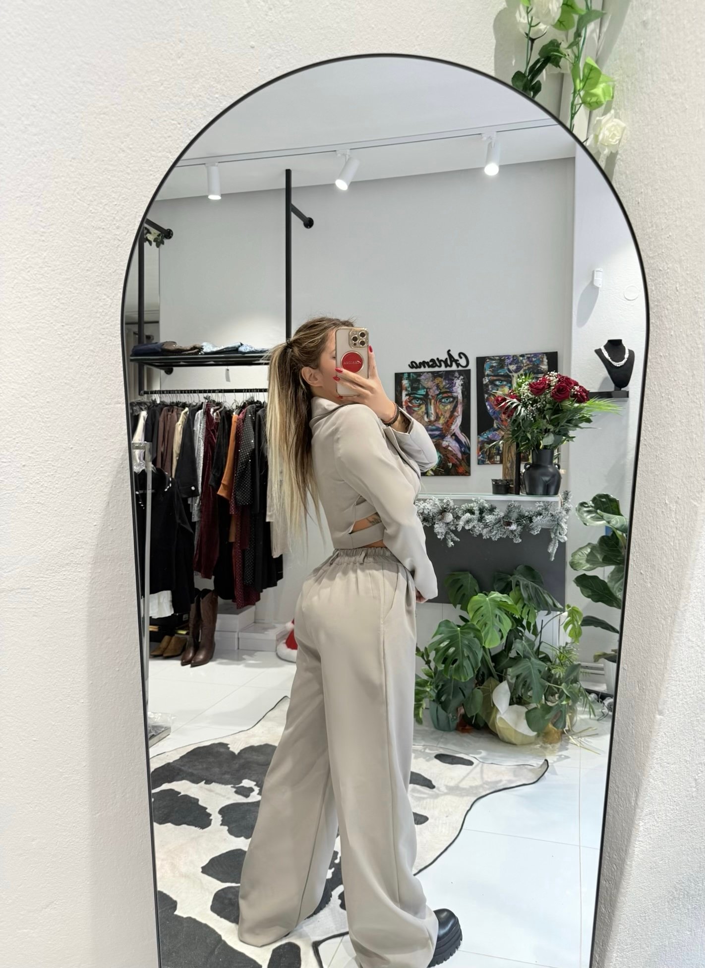 Το σακάκι, με την εφαρμοστή γραμμή που στενεύει διακριτικά προς τα κάτω, αναδεικνύει τη μέση και δημιουργεί μία εκλεπτυσμένη, sculpted σιλουέτα. Τα πλαϊνά ανοίγματα προσθέτουν μια ανεπαίσθητη δόση θηλυκότητας, ενώ το παντελόνι ολοκληρώνει το look με άψογη ραφή και καθαρό design.