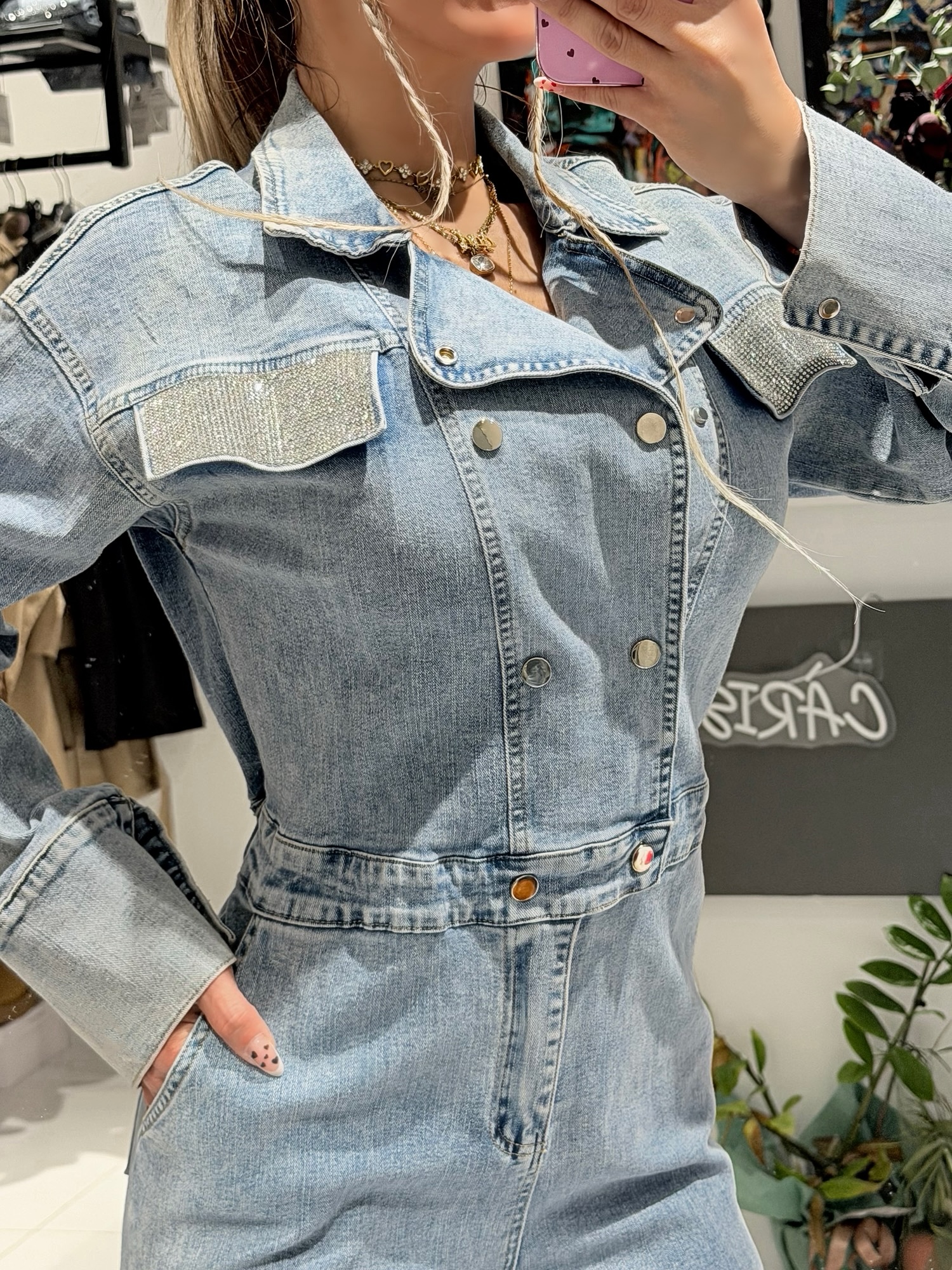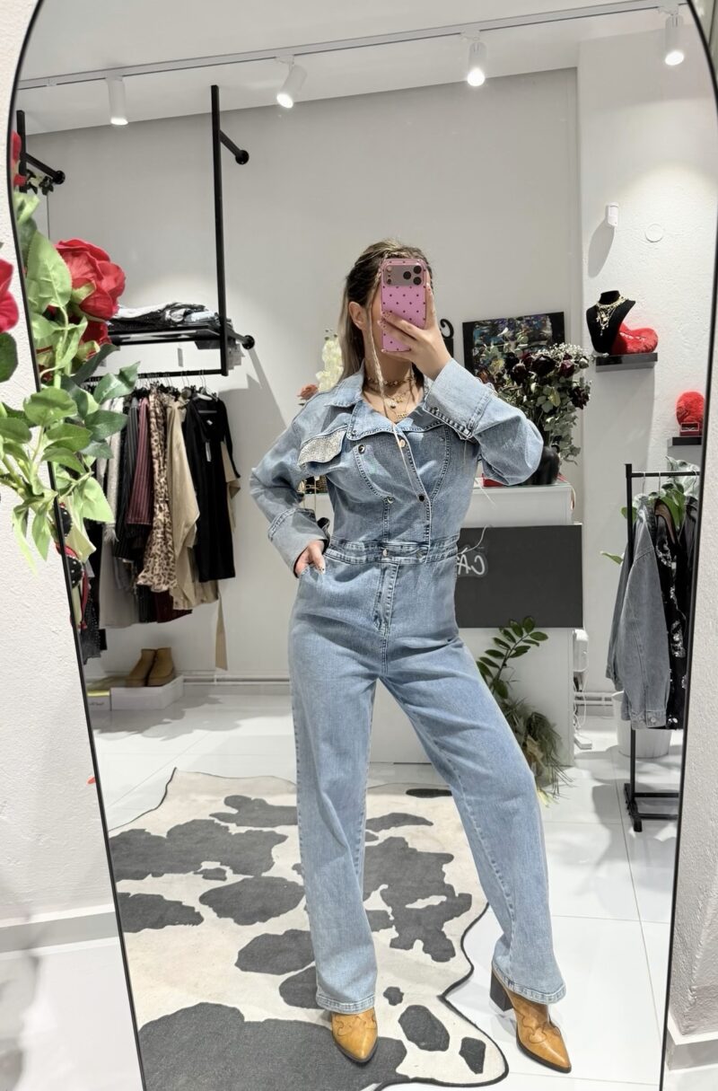 • Λεπτομέρειες με Strass: Το highlight του ρούχου είναι οι εντυπωσιακές τσέπες με στρας στο στήθος, που προσθέτουν την απαραίτητη λάμψη στο denim ύφασμα.