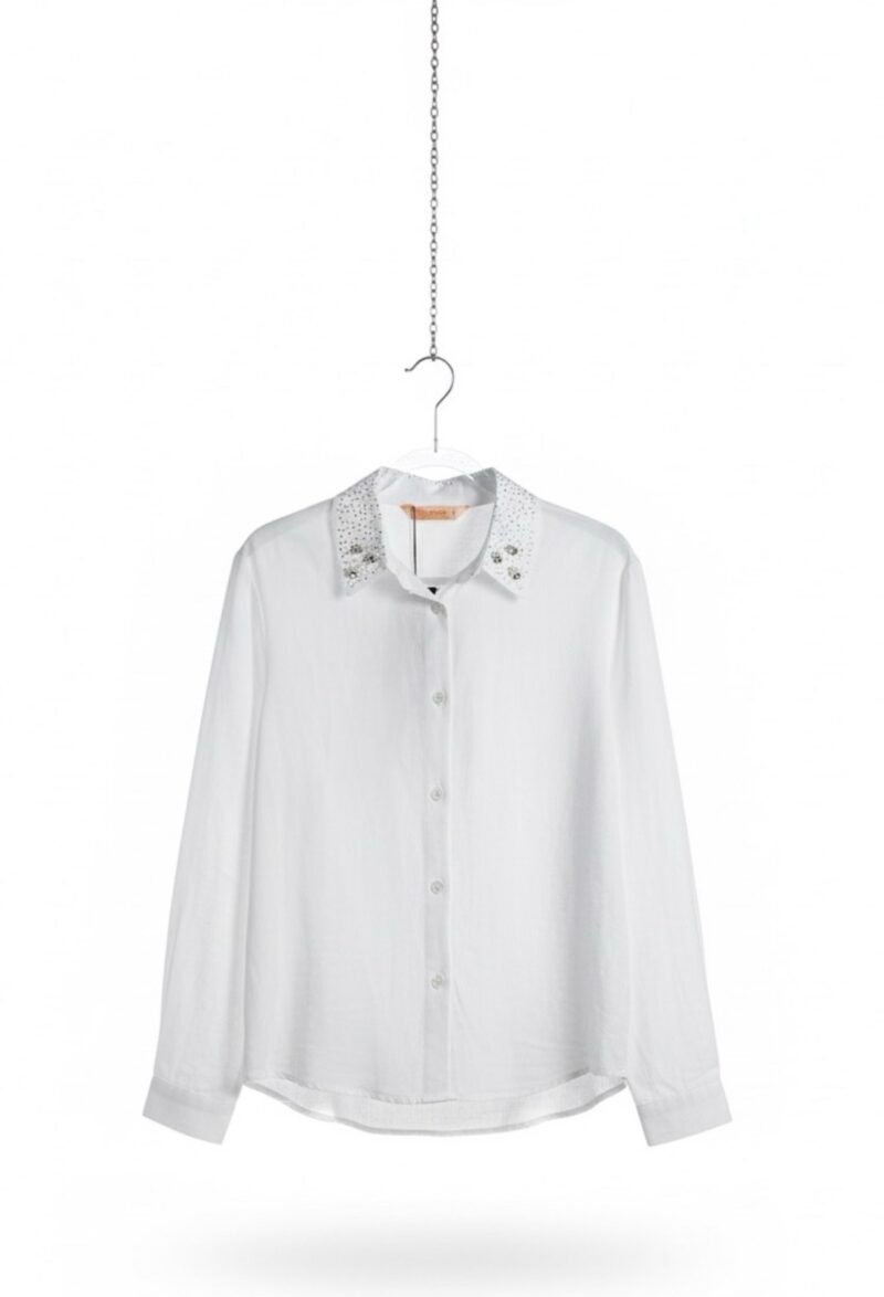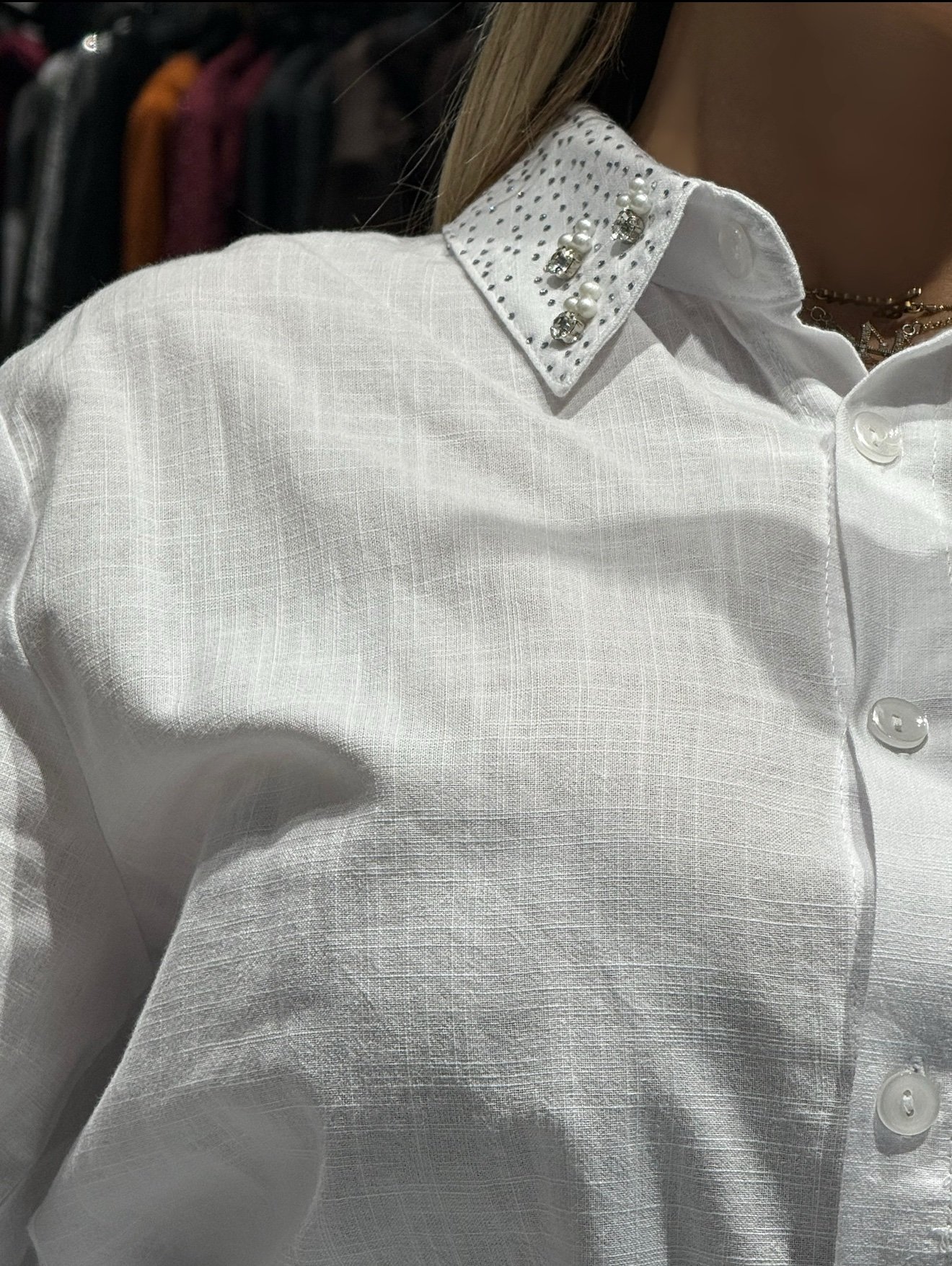 • Λεπτομέρεια: Χειροποίητη διακόσμηση στον γιακά με στρας και πέρλες που αντικαθιστούν την ανάγκη για κόσμημα.