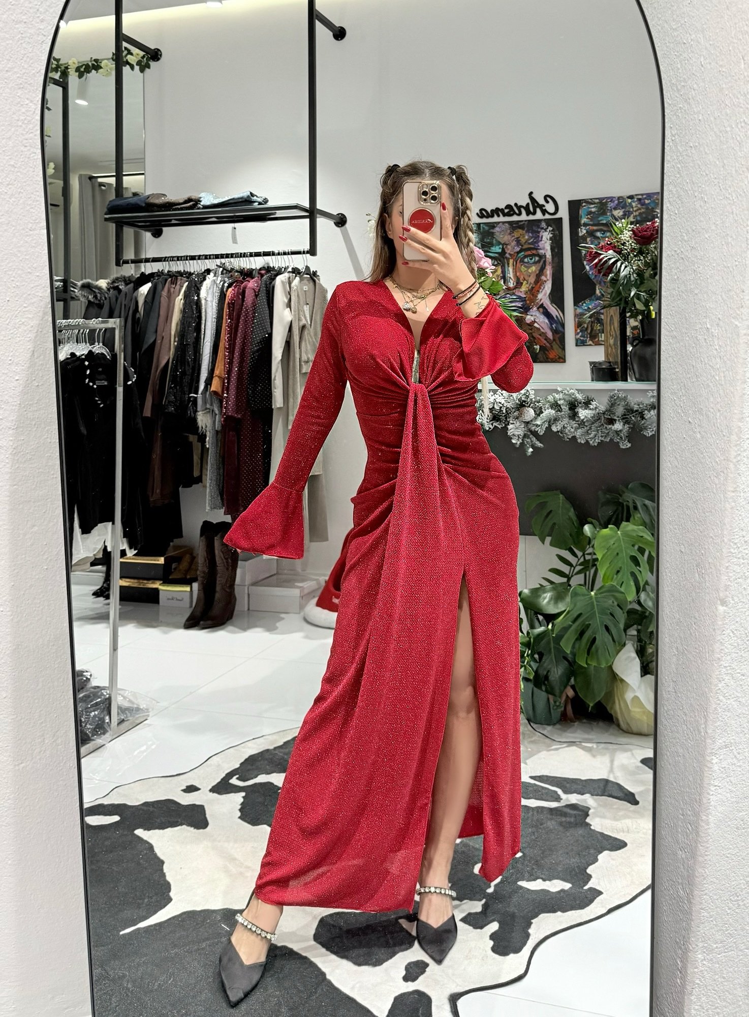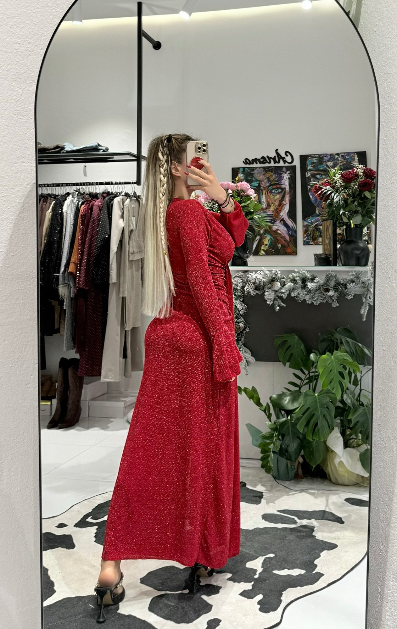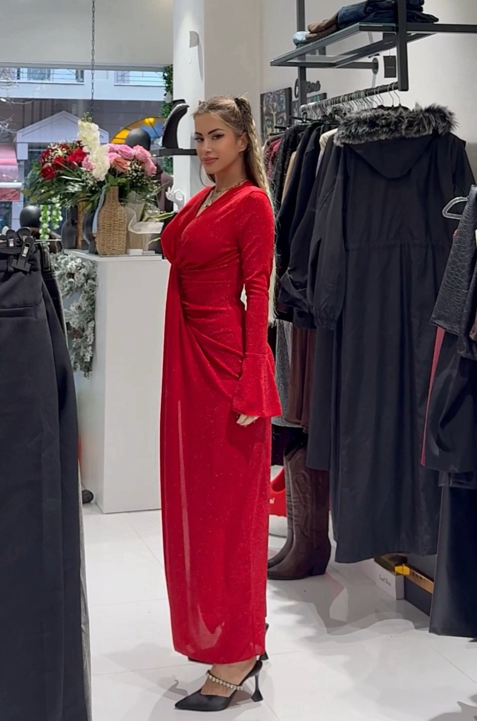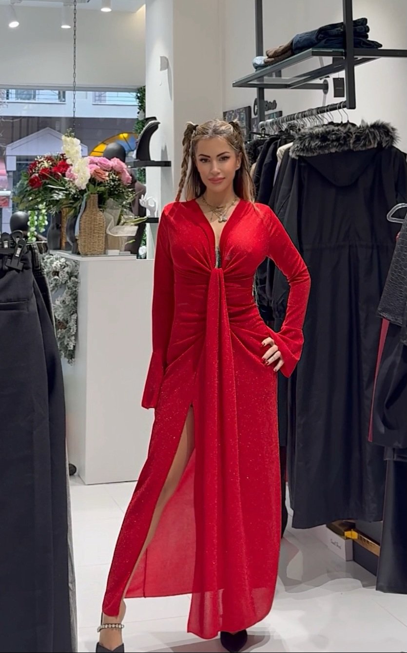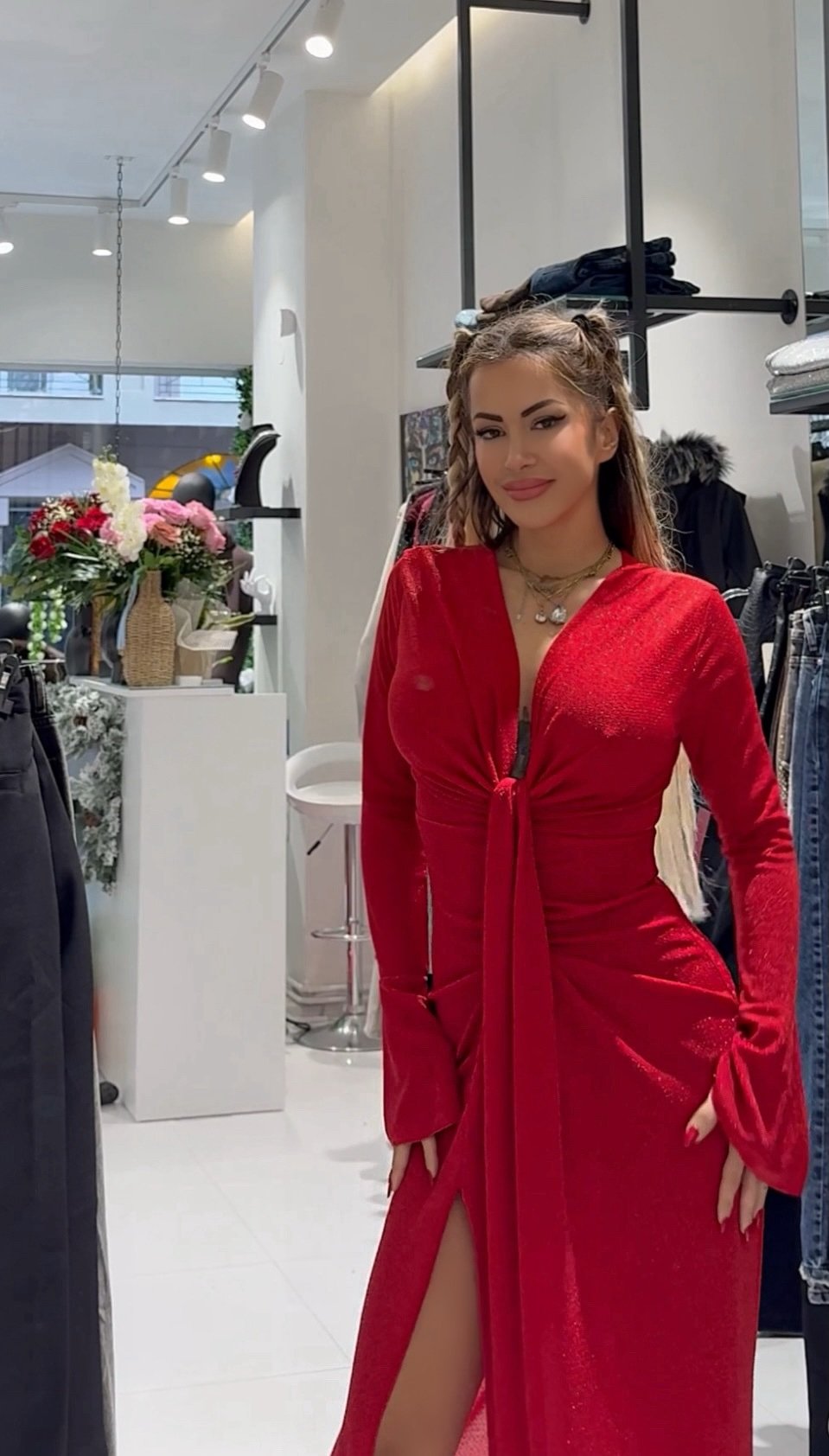 Ετοιμαστείτε για τις πιο λαμπερές εμφανίσεις των Χριστουγέννων και των εορτών με το φόρεμα Marilyn. Αυτό το εντυπωσιακό μάξι φόρεμα, διαθέσιμο σε ευέλικτο one size, είναι κατασκευασμένο από αστραφτερό lurex ύφασμα που εξασφαλίζει μοναδική λάμψη. Η γραμμή του αγκαλιάζει τη σιλουέτα, ενώ το βαθύ σκίσιμο μπροστά και το θηλυκό άνοιγμα/κόμπος στο μπούστο δημιουργούν ένα εκρηκτικό, glamorous αποτέλεσμα. Με τα μακριά μανίκια-καμπάνα, αποτελεί την απόλυτη επιλογή για κάθε επίσημο event αυτή την περίοδο.