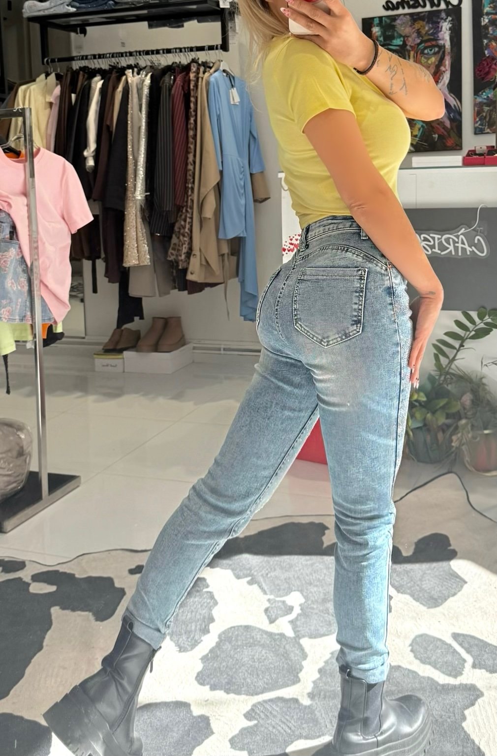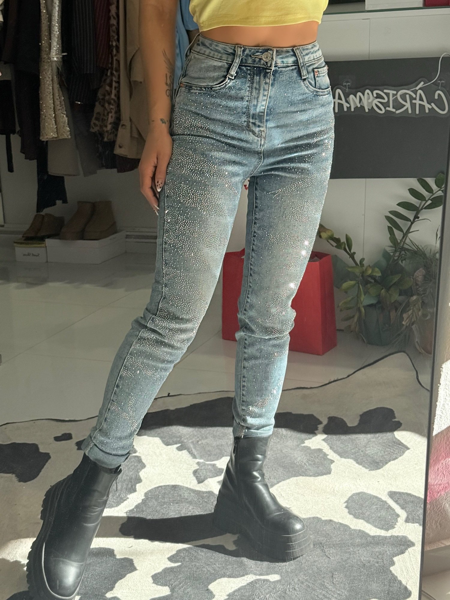 Αυτό το τζιν είναι η ιδανική επιλογή για όσες θέλουν να συνδυάσουν την άνεση με μια έντονη δόση λάμψης και στυλ. Ο σχεδιασμός του αναδεικνύει τη σιλουέτα, ενώ οι λεπτομέρειες με τα στρας το κάνουν να ξεχωρίζει.