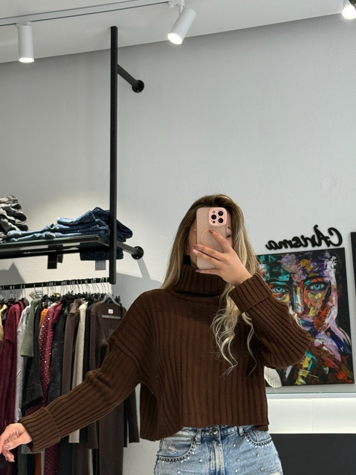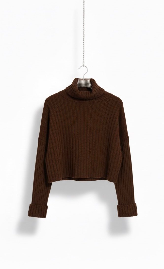 “Martha” Cropped Rib Turtleneck Sweater – Brown
