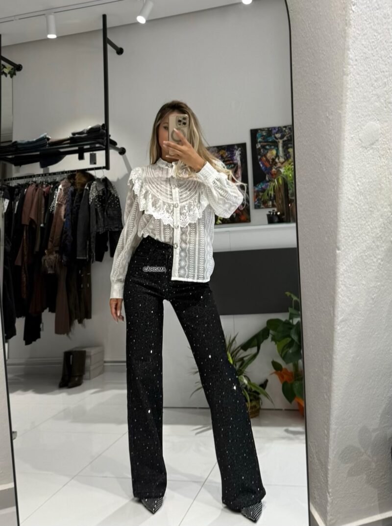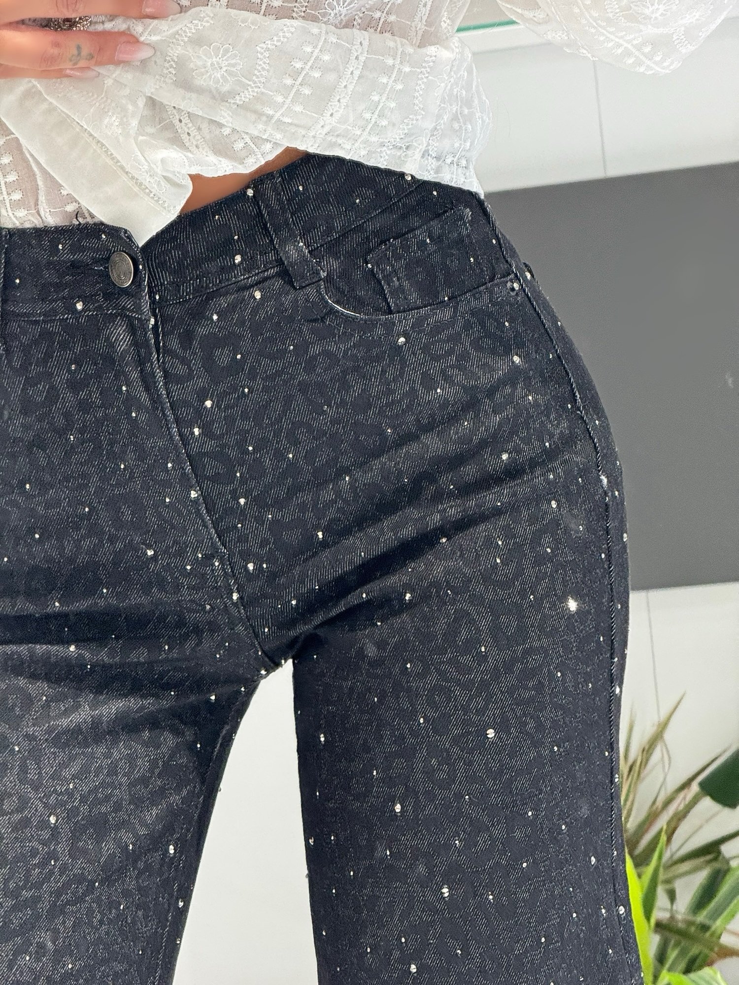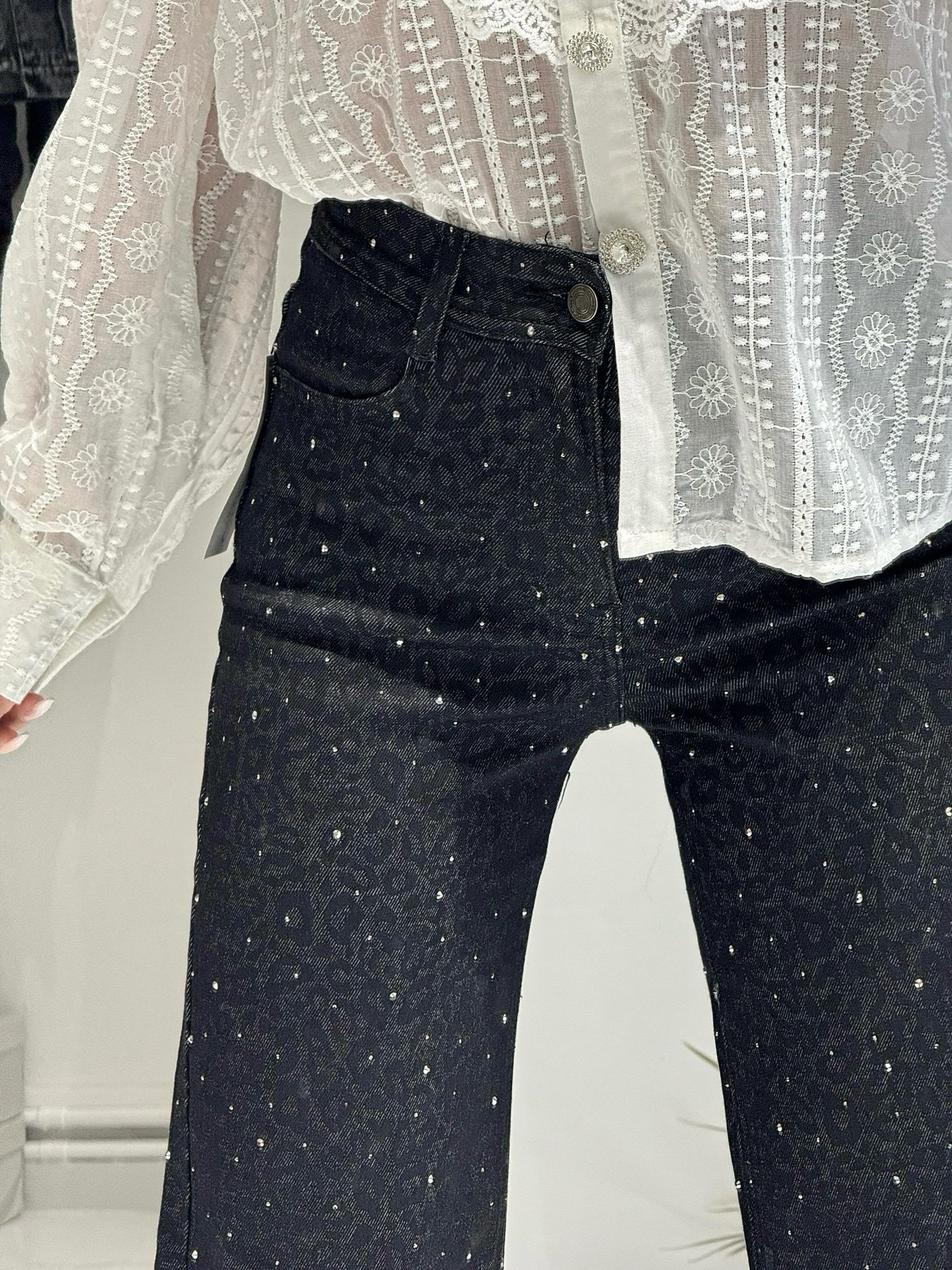 Το τζιν Meline συνδυάζει κομψότητα και άνεση σε γραμμή wide leg. Μαύρο λεοπάρ μοτίβο με διακριτικά στρας που λαμπυρίζουν στο φως, προσφέρει εντυπωσιακό αποτέλεσμα σε κάθε κίνηση. Ένα κομμάτι που αναβαθμίζει κάθε βραδινό look, διατηρώντας παράλληλα το άνετο, μοντέρνο στιλ του.
