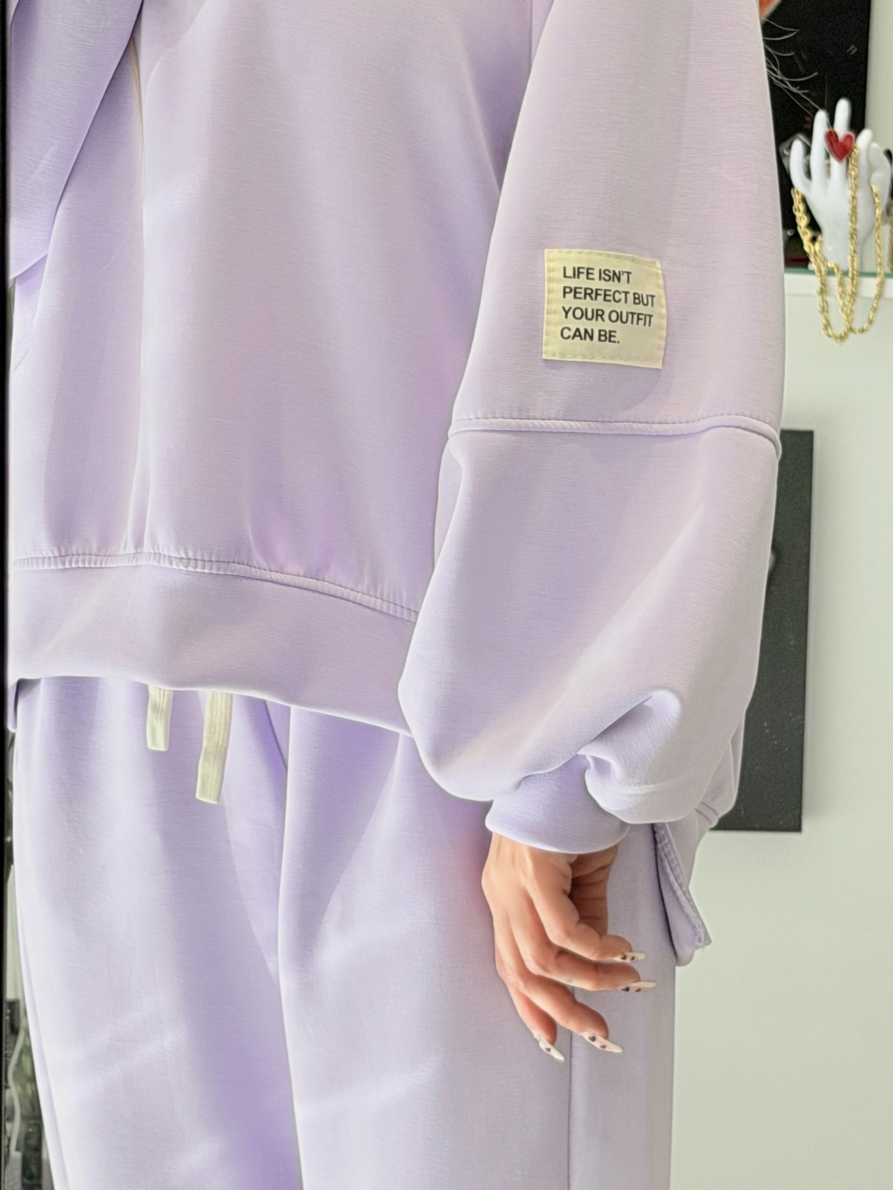 • Statement Λεπτομέρεια: Υφασμάτινο patch στο μανίκι με το quote: “Life isn’t perfect but your outfit can be”.