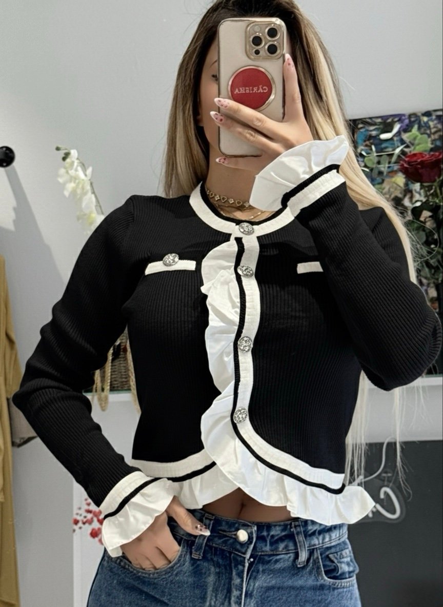 Αυτή η πλεκτή ζακέτα-μπλουζάκι σε κλασικό ασπρόμαυρο συνδυασμό φέρνει τον αέρα της γαλλικής ριβιέρας στην γκαρνταρόμπα σας. Με θηλυκά βολάν και πολυτελή κουμπιά, το “Monaco” είναι το κομμάτι που θα μεταμορφώσει ακόμα και το πιο απλό look σε μια high-end εμφάνιση.
