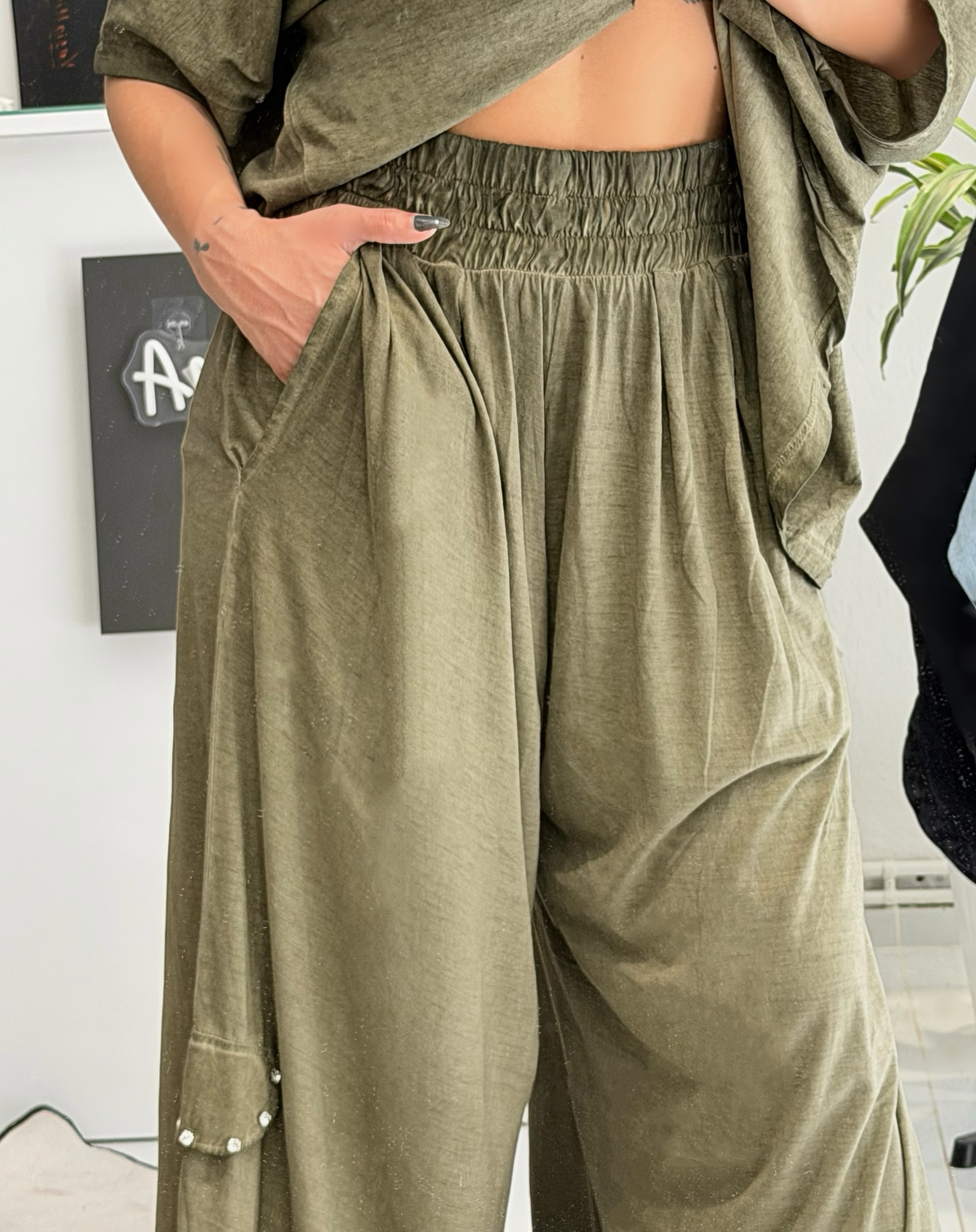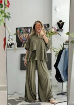 • Design & Στυλ: Oversized γραμμή που προσφέρει ελευθερία κινήσεων και απαράμιλλο στυλ. Το σετ αποτελείται από ένα άνετο top και μια φαρδιά παντελόνα σε γήινο λαδί χρώμα.