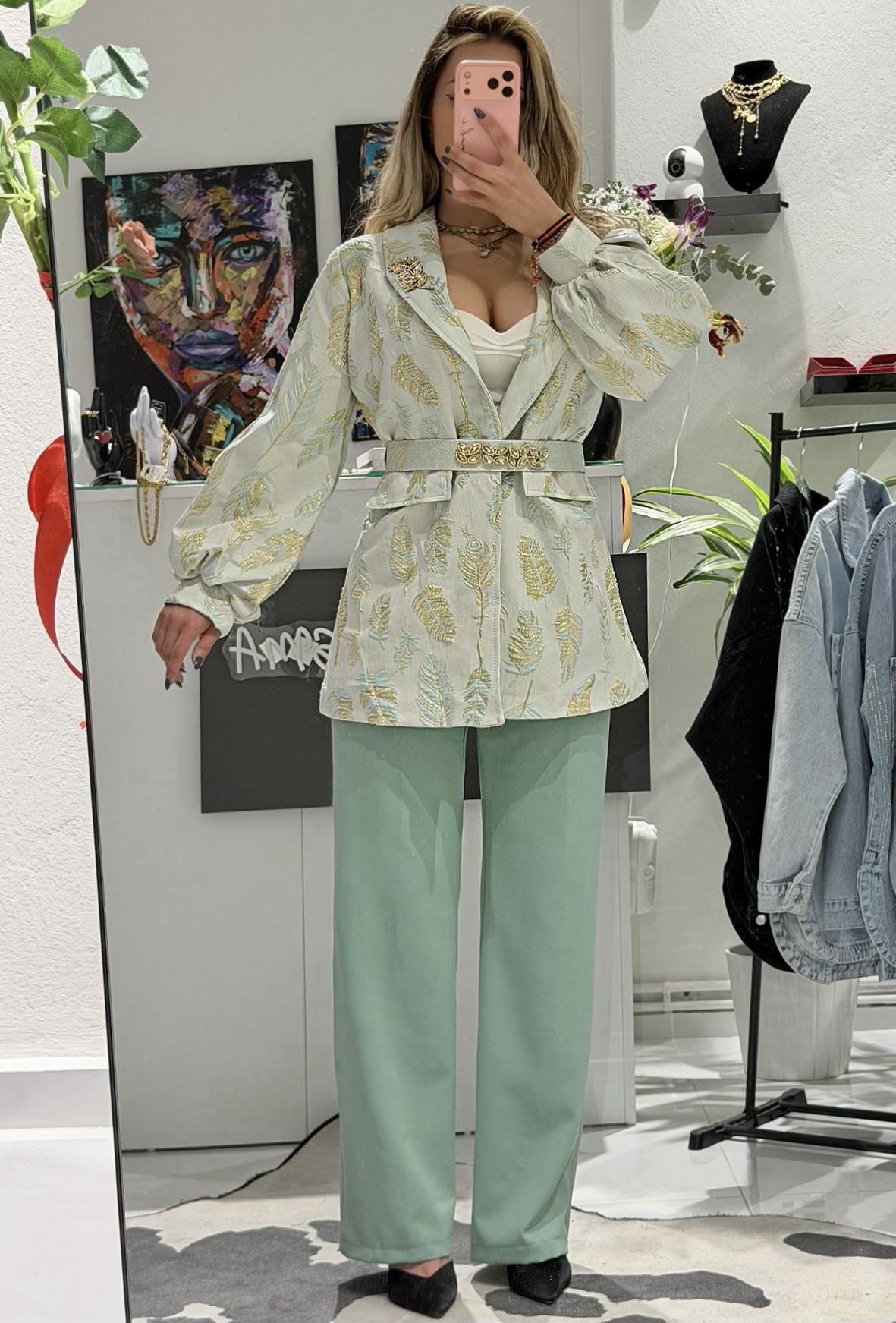 • Το Παντελόνι: Σε γραμμή που κολακεύει, το παντελόνι σε mint απόχρωση ολοκληρώνει το look με αέρινη κίνηση και απόλυτη άνεση.