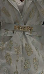 • Η Ζώνη: Η αντίστοιχη υφασμάτινη ζώνη στη μέση διαθέτει κοσμηματοποιημένη αγκράφα με κρύσταλλα σε σχήμα φύλλων, σμιλεύοντας τη σιλουέτα και προσφέροντας λάμψη.