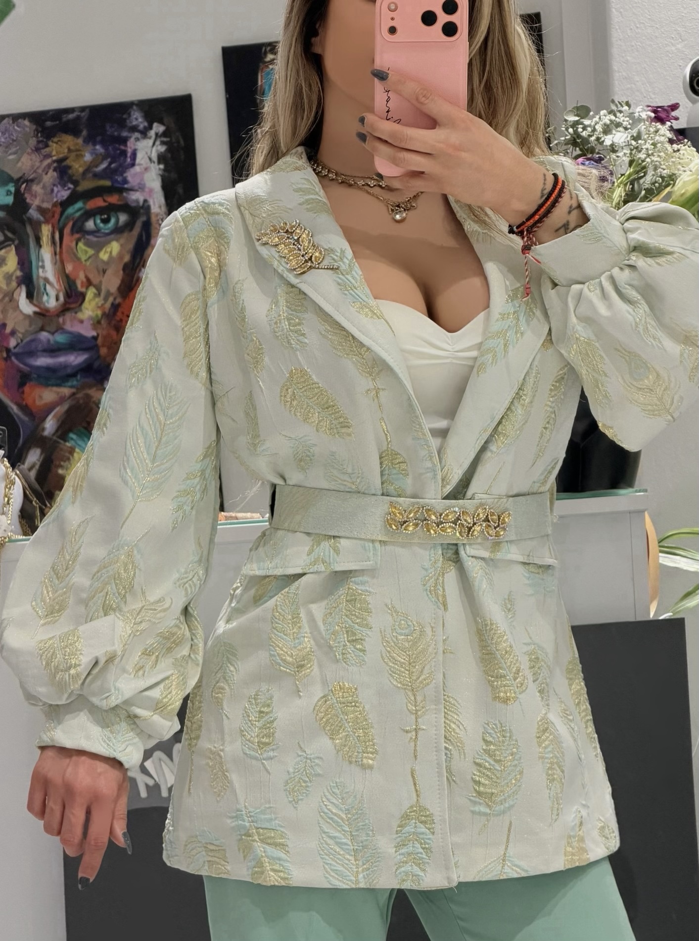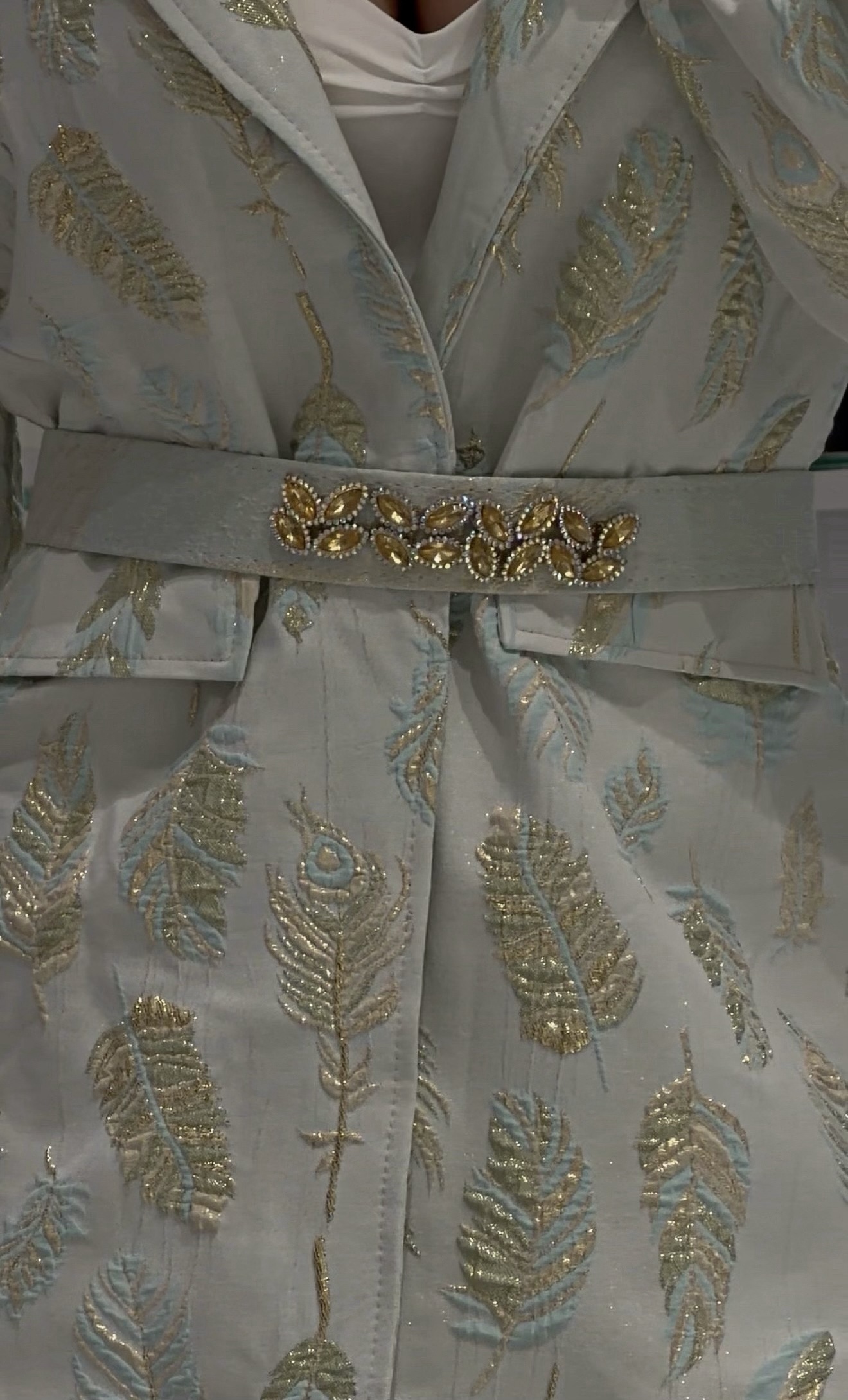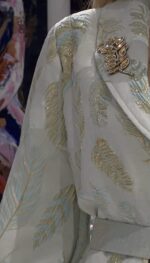• Το Σακάκι: Ένα statement κομμάτι από πολυτελές ανάγλυφο ύφασμα με χρυσοκέντητα μοτίβα φτερών. Διαθέτει εντυπωσιακά μανίκια balloon που καταλήγουν σε κομψές μανσέτες, προσθέτοντας μια δόση ρομαντισμού και δυναμισμού ταυτόχρονα.