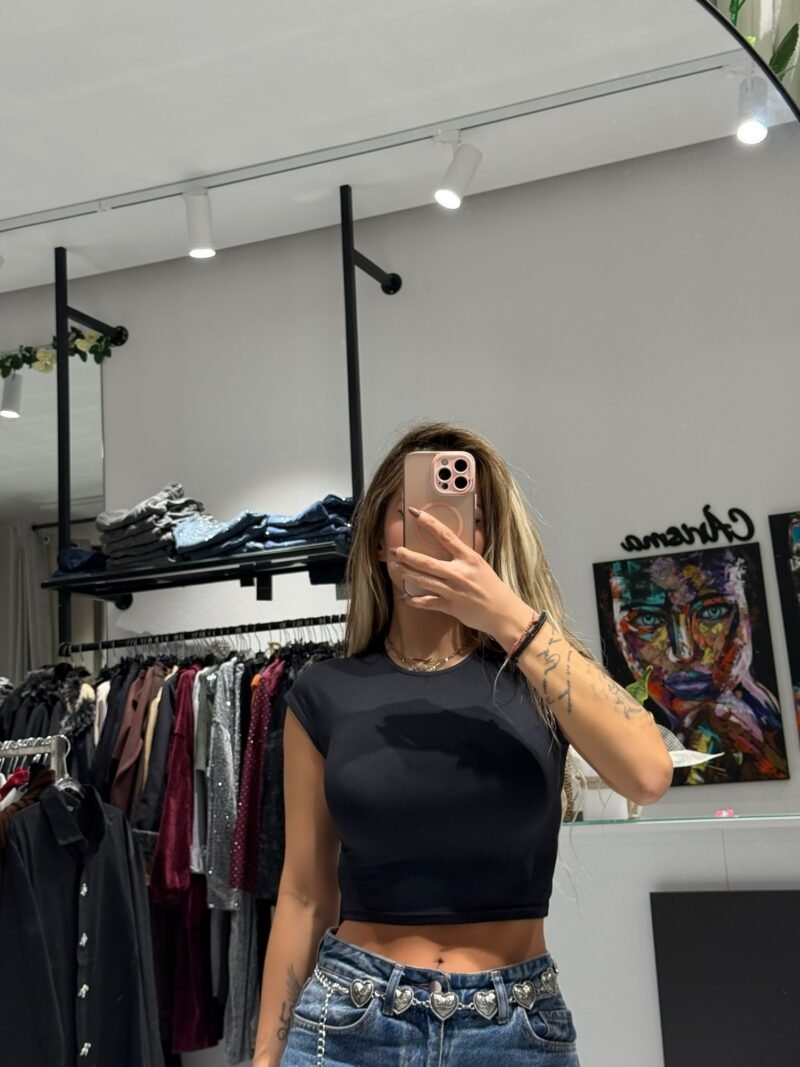 Πρόκειται για ένα εφαρμοστό cropped t-shirt με κοντά μανίκια (τύπου καπάκι/cap sleeves) και στρογγυλή λαιμόκοψη. Η εφαρμογή του είναι ελαστική και αγκαλιάζει τη σιλουέτα, καθιστώντας το ιδανικό για layering ή ως statement κομμάτι από μόνο του. Διατίθεται σε δύο κλασικές αποχρώσεις: Απόλυτο Λευκό (White) και Κλασικό Μαύρο (Black).