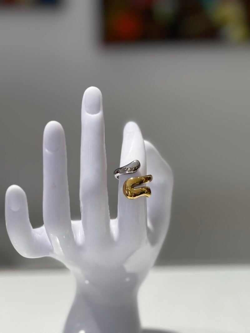 Εκλεπτυσμένο στυλ με μοντέρνο twist. Αυτό το δαχτυλίδι από ανοξείδωτο ατσάλι ξεχωρίζει με το γεωμετρικό, κυματιστό του σχήμα και την εντυπωσιακή δίχρωμη απόχρωση (χρυσό και ασημί). Ο σχεδιασμός του είναι αυξομειούμενος, αγκαλιάζοντας τέλεια κάθε δάχτυλο για μια μοναδική εμφάνιση που δεν περνά απαρατήρητη.