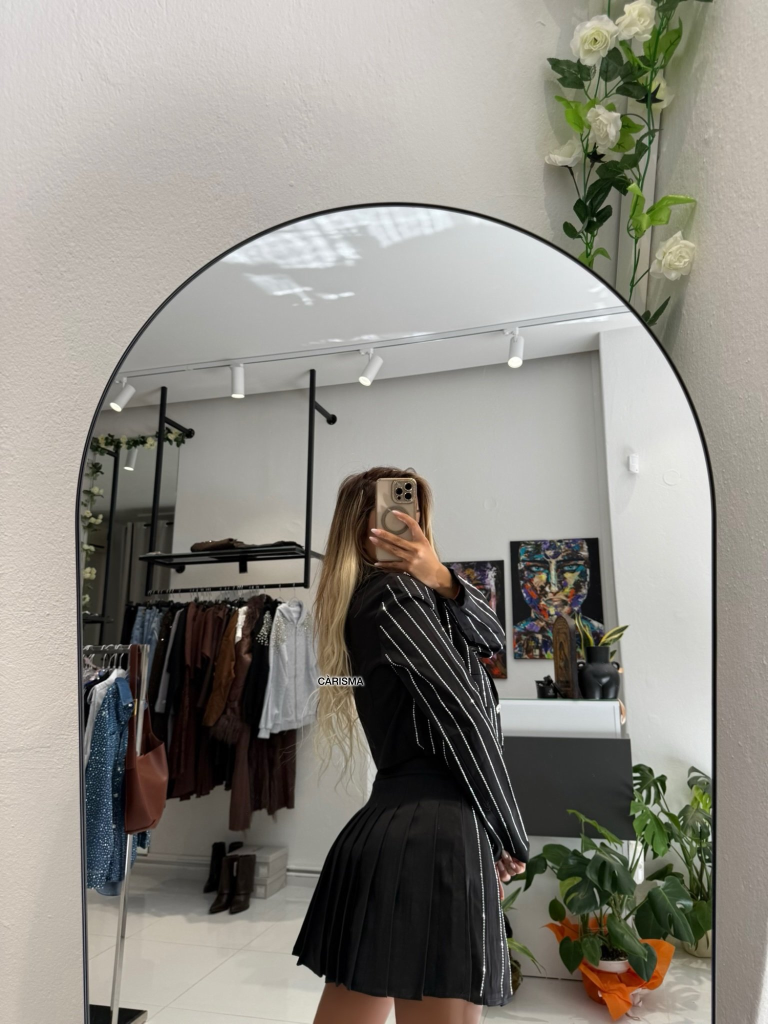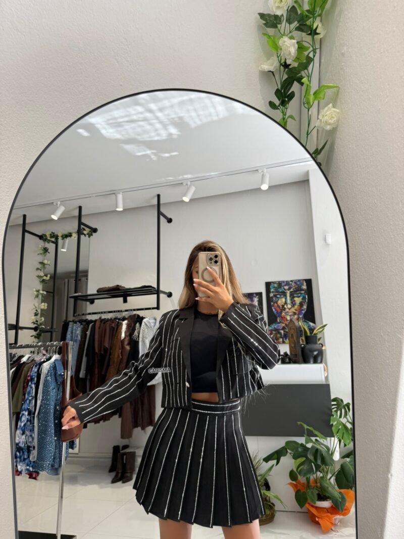 Séralia – Σετ από cropped σακάκι και φούστα με πιέτες, διακοσμημένο με λαμπερές γραμμές στρας μπροστά. Η φούστα διαθέτει εσωτερικό σορτς για απόλυτη άνεση, ενώ η κομψή γραμμή και η λαμπερή λεπτομέρεια το καθιστούν ιδανικό για βραδινές εμφανίσεις ή ξεχωριστές στιγμές που θέλεις να εντυπωσιάσεις.