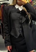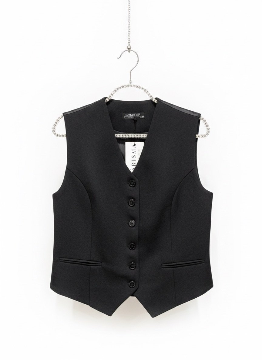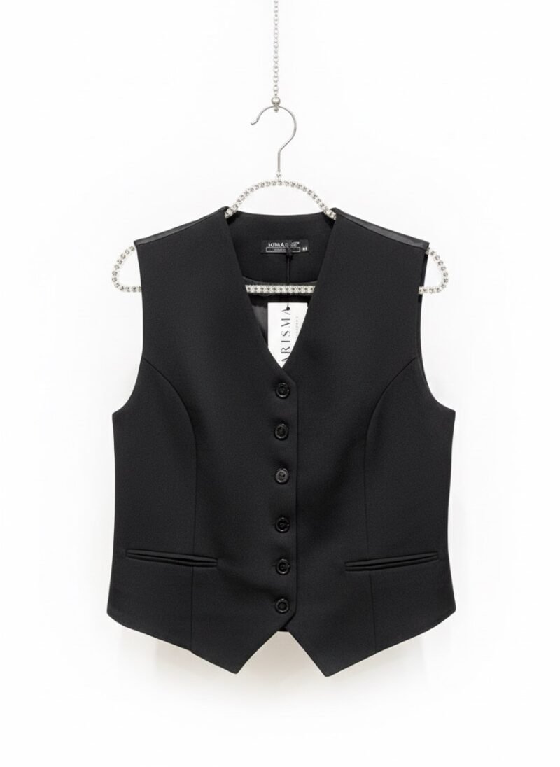 Κομψό μαύρο γιλέκο σε κλασική, δομημένη γραμμή, ιδανικό για ένα αυστηρό και ταυτόχρονα μοντέρνο ντύσιμο. Διαθέτει κλείσιμο μπροστά με μία σειρά κουμπιών και δύο διακοσμητικές τσέπες (φιλέτο) στο μπροστινό μέρος. Η εφαρμογή του είναι στενή και κολακευτική. Διατίθεται σε μεγέθη από XS έως L