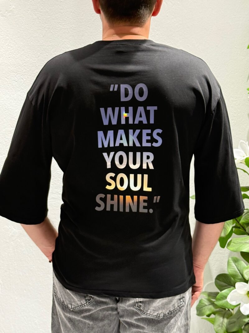 Μαύρο T-shirt με 3/4 μανίκι και oversized γραμμή. Statement print στο πίσω μέρος “Do what makes your soul shine”, διαθέσιμο σε δύο αποχρώσεις logo. Ένα κομμάτι που ξεχωρίζει με στυλ και θετική ενέργεια.